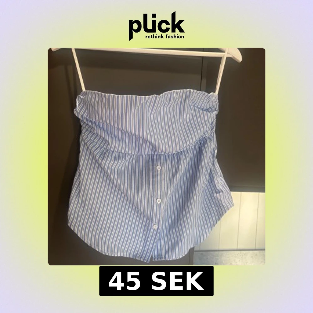 Säljer en blå och vit randig tubtopp med knappar framtill. Toppen har bandeau-modell och är sydd i bomullstyg med klassiska skjortränder. Perfekt för en fräsch och avslappnad look i sommar.