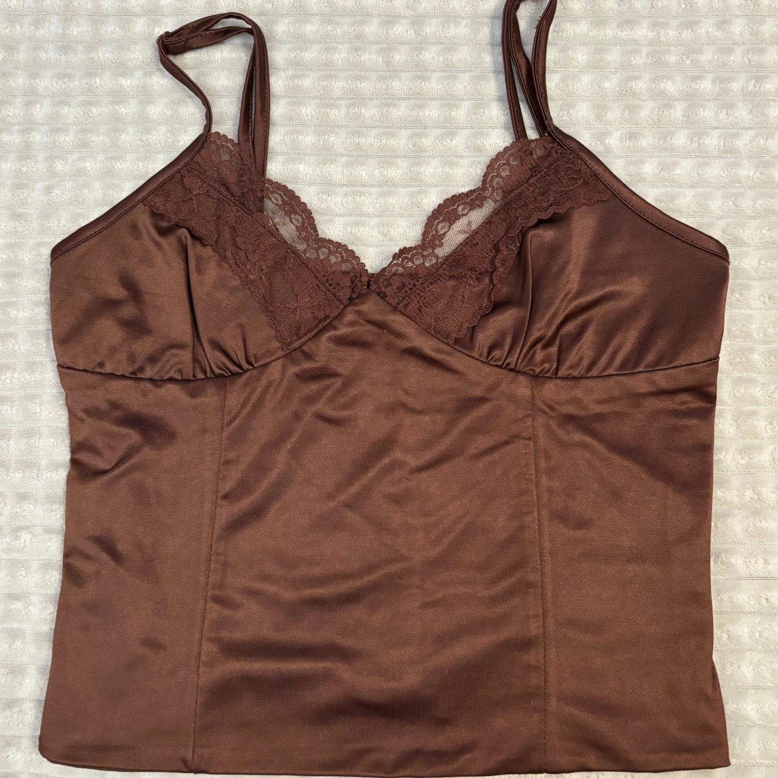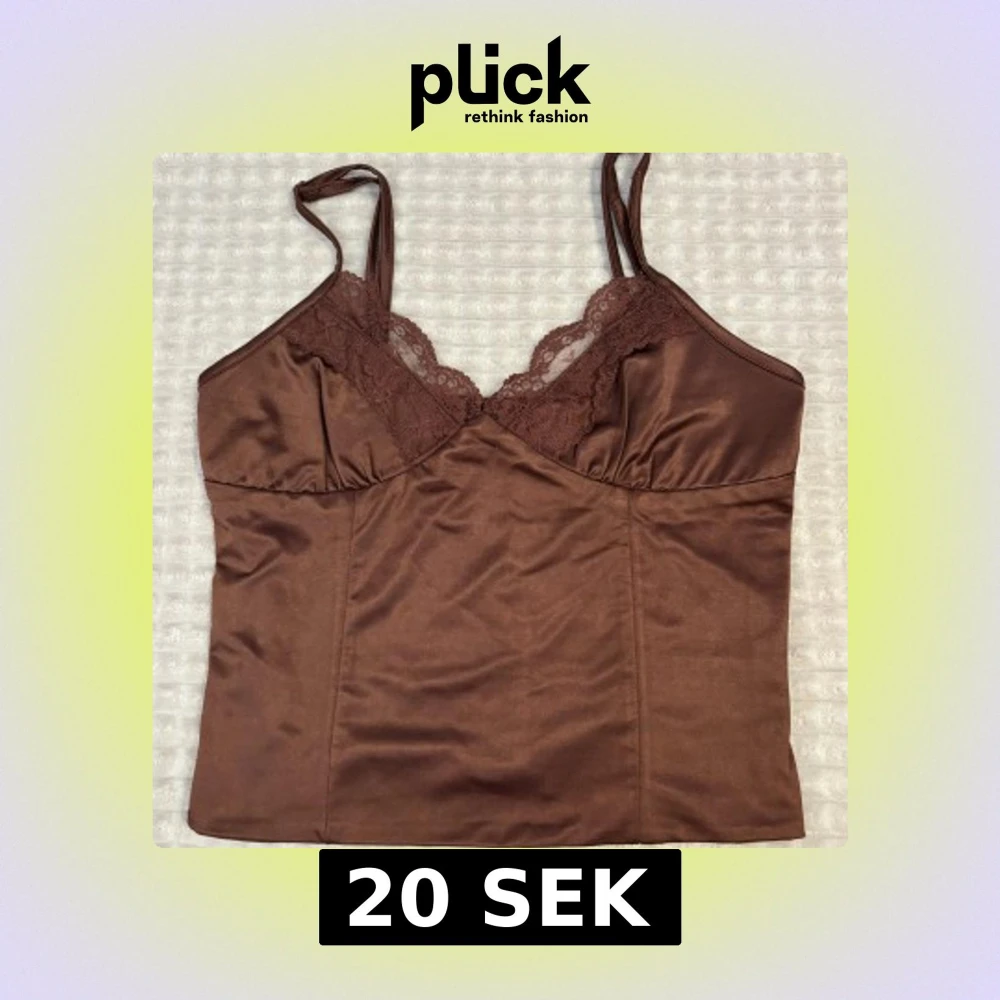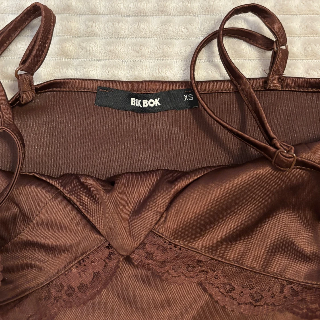 Supersnygg brun linnetopp från Bik Bok i satin med tunna axelband och spetsdetaljer . Sitter figurnära och har en mjuk glansig finish. endast använd en gång för några år sedan. Inga skador. Storlek Xs