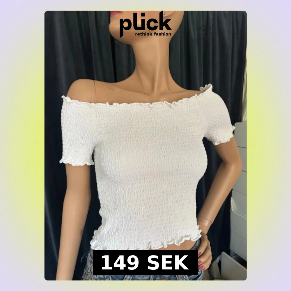 Trendig vit oneshoulder topp med smockad struktur och korta ärmar. Toppen har volangkant vid halsringning, ärmslut och nederkant för en söt touch. Passar small!! Perfekt att styla med jeans eller kjol för en fräsch look.