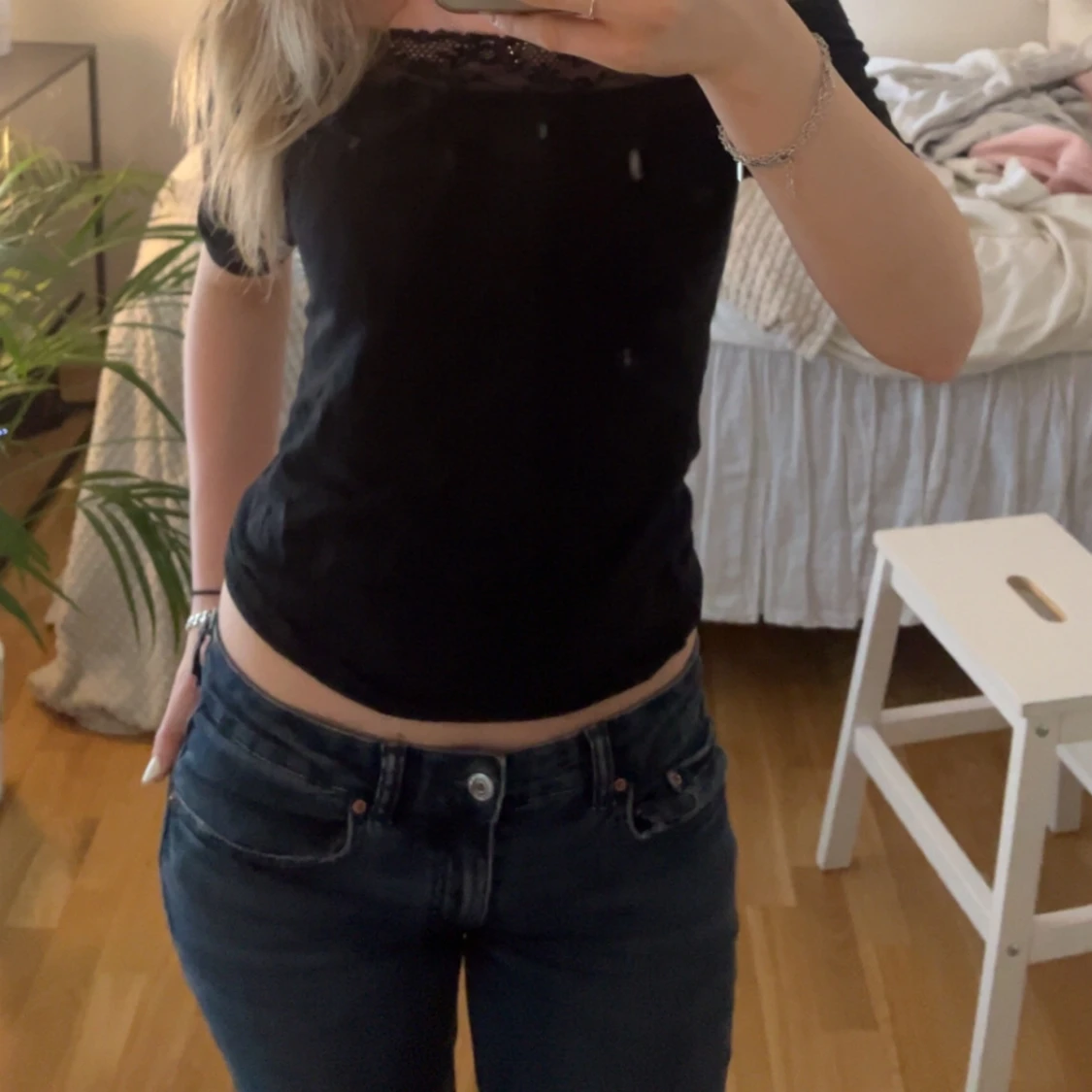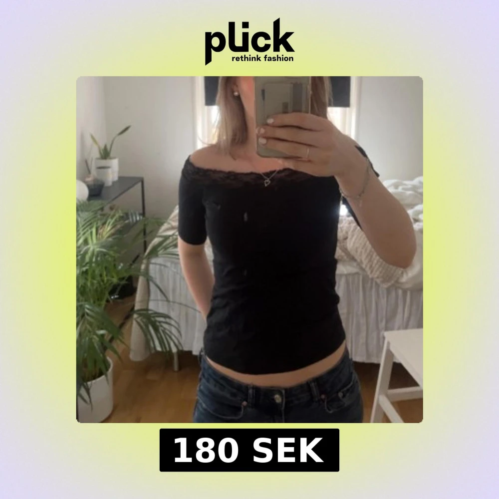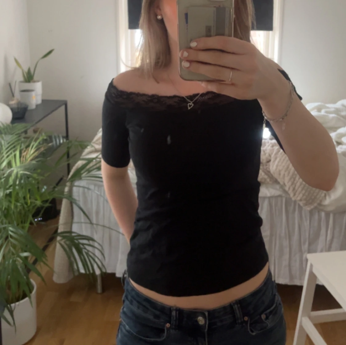 Säljer denna svarta offshoulder topp med spets, då den tyvärr inte kommer till användning längre💓 storleken står ej men skulle säga att den passar en xs/s