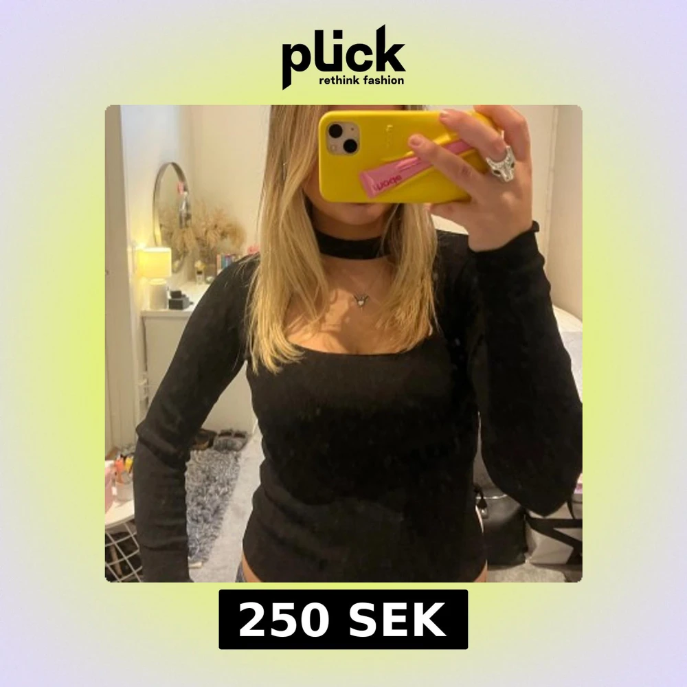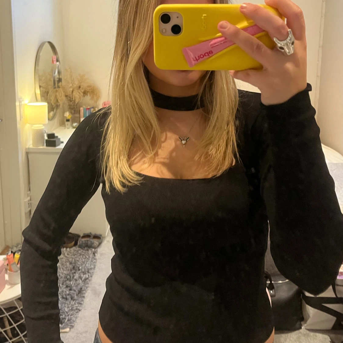 Säljer en svart långärmad topp med fyrkantig urringning och inbyggd choker-detalj vid halsen. Snygg och stilren modell som sitter tight och framhäver figuren. Perfekt för dig som gillar trendiga och unika detaljer.
