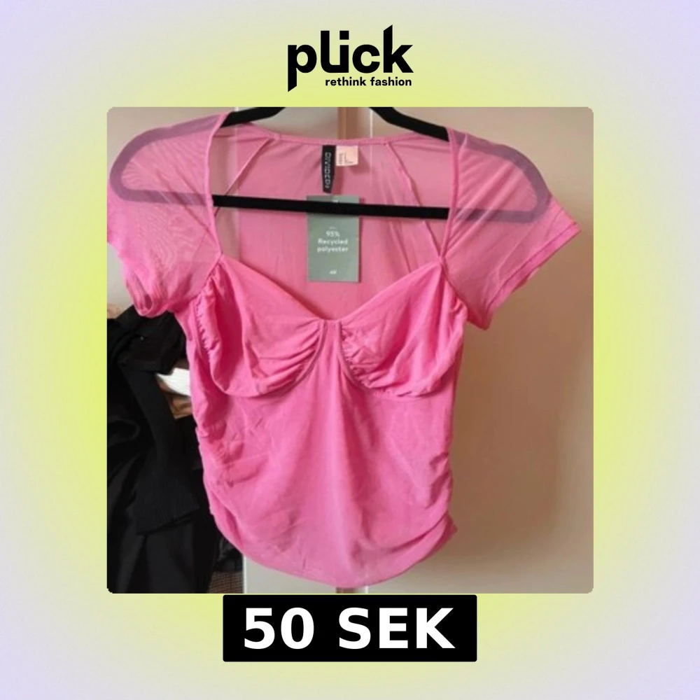 Säljer en rosa mesh topp från H&M Divided i storlek S Toppen har korta ärmar och en snygg rynkad detalj vid bysten. Tillverkad av 95% återvunnen polyester, perfekt för en trendig look.