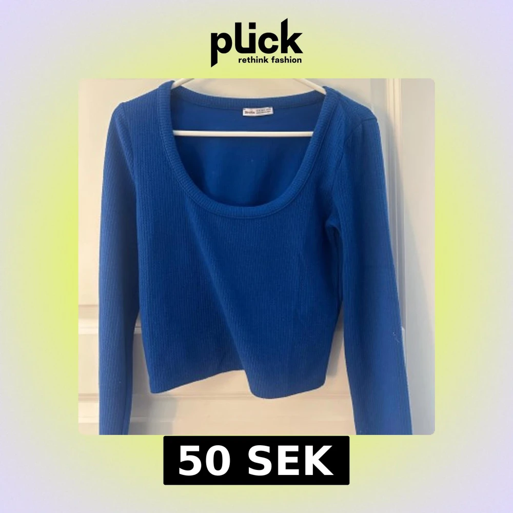 Säljer en blå ribbad långärmad topp från Bershka med rund, djup urringning. Toppen är croppad och har en tight passform som sitter snyggt på kroppen. Perfekt att styla med höga jeans eller kjol.