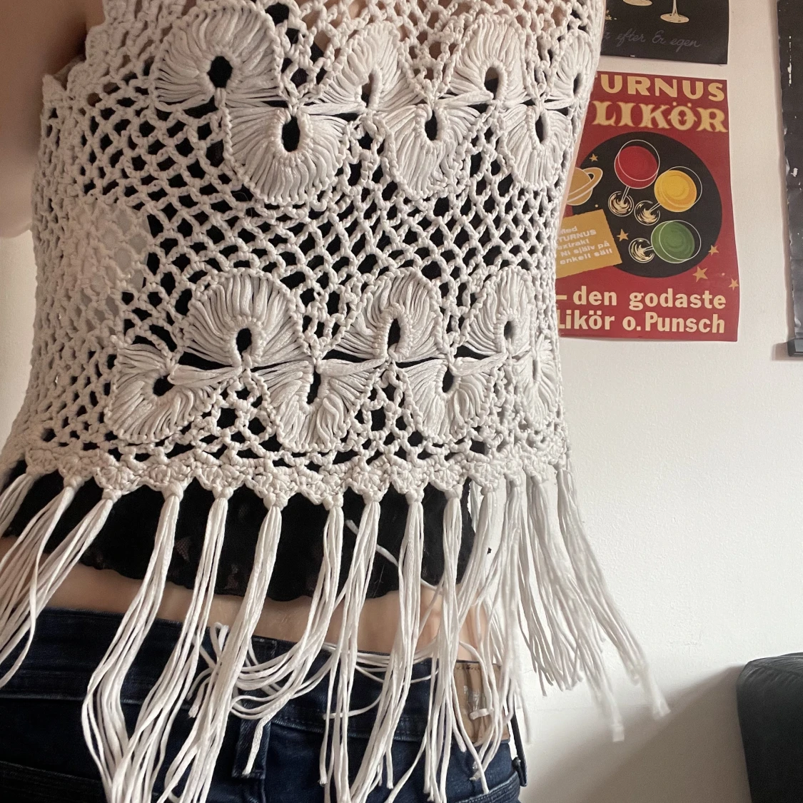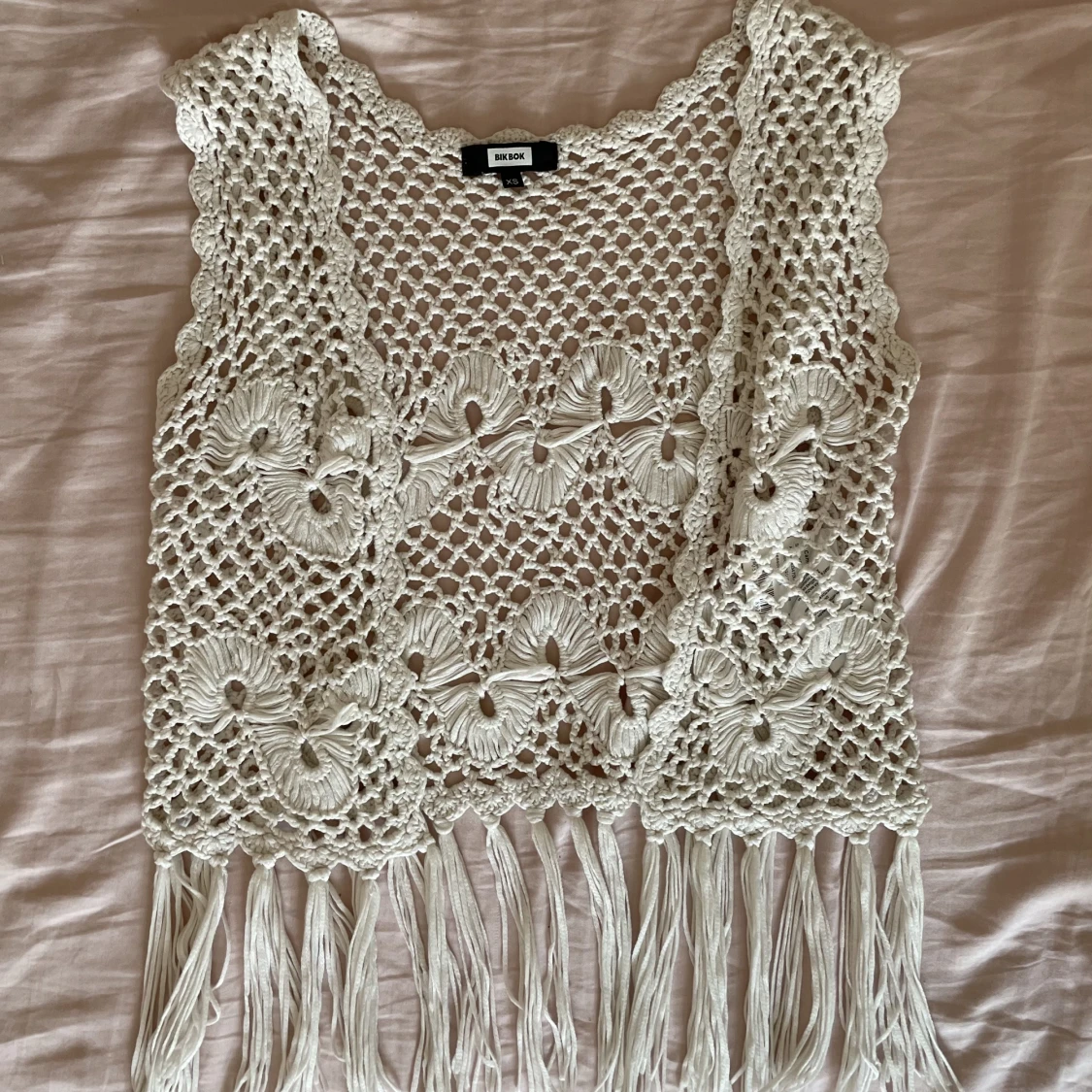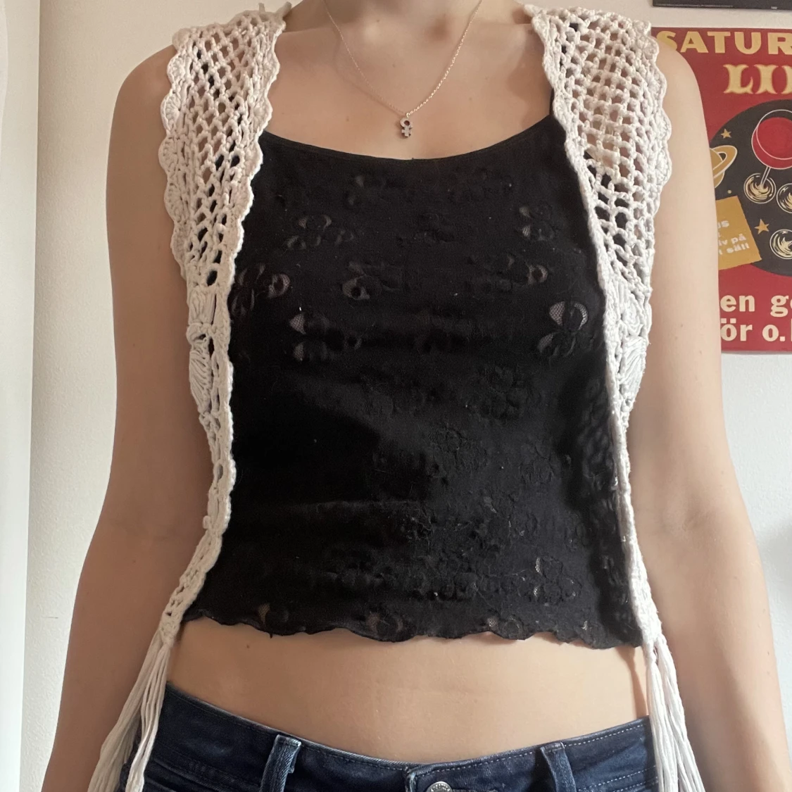 Virkad liten väst med blommönster och fransar nedtill. Storlek xs, passar mig som brukar ha s-m. Kan mötas i närheten av Mariatorget eller posta.