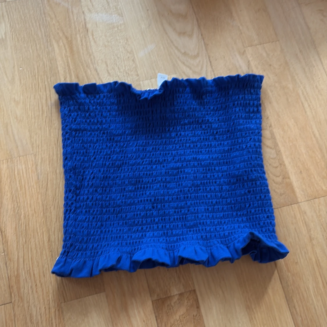 Säljer en blå tubtopp med volangdetaljer upptill och nedtill. Toppen har en smockad design som ger en stretchig och bekväm passform. Perfekt för sommarens varma dagar!