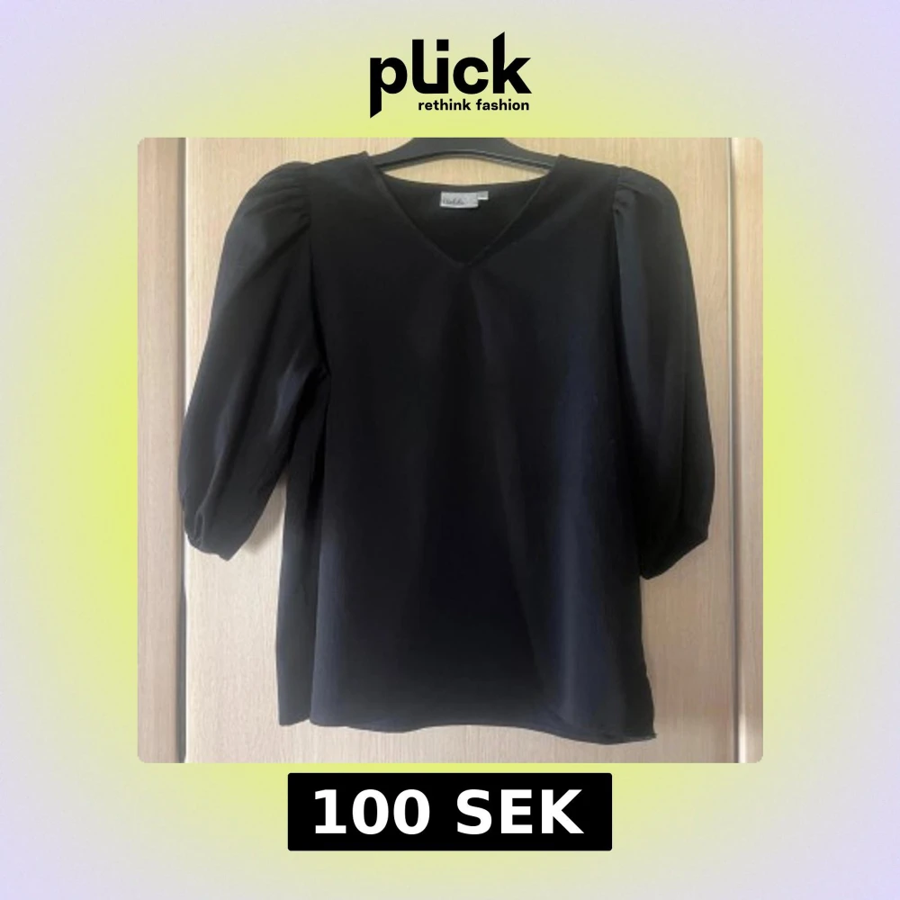 Elegant svart blus med v-ringning och trekvartsärmar. Perfekt för en stilren look.