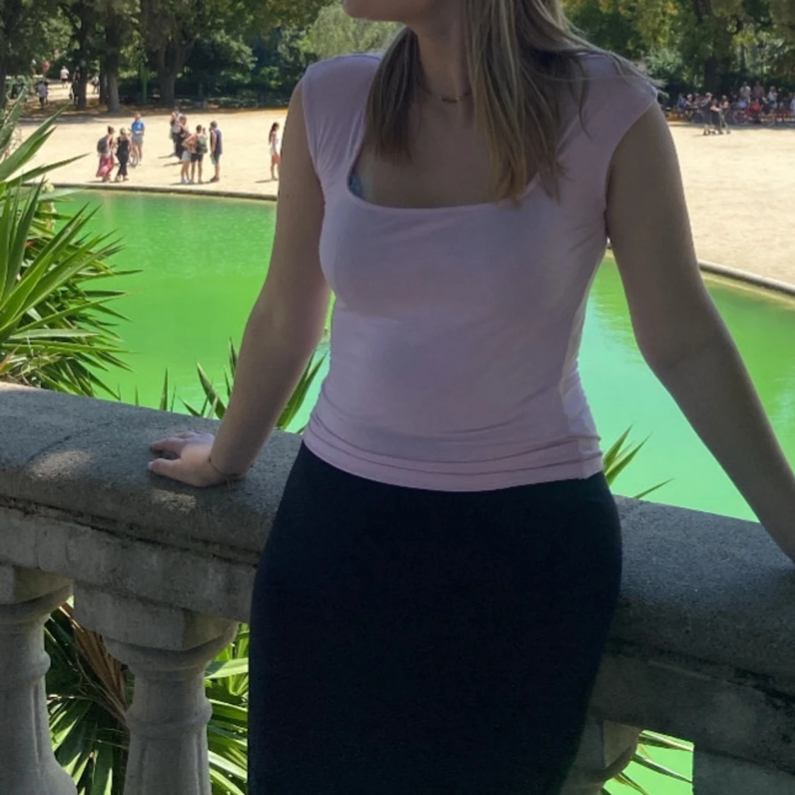 Säljer en ljusrosa topp med korta ärmar och en fyrkantig halsringning. Toppen är figurnära och passar perfekt för varma dagar.🩷