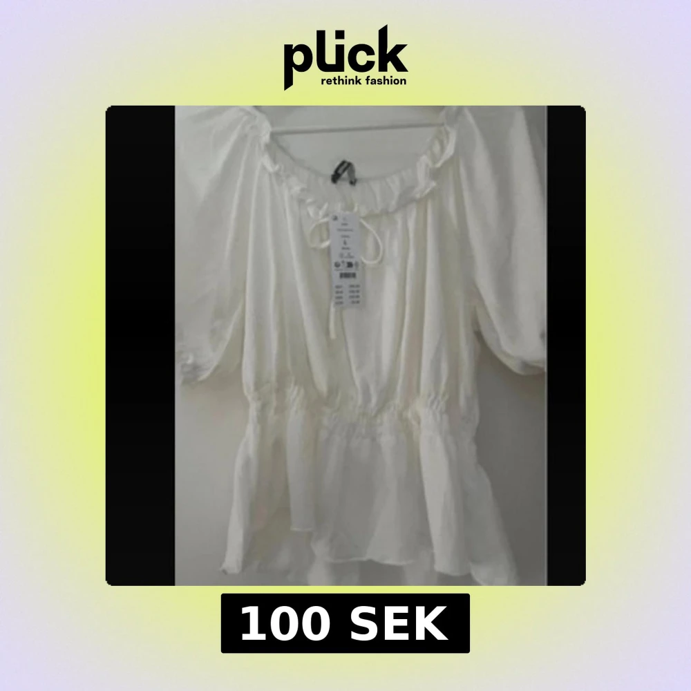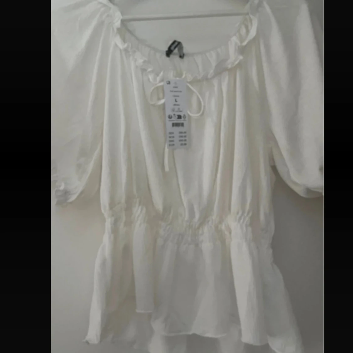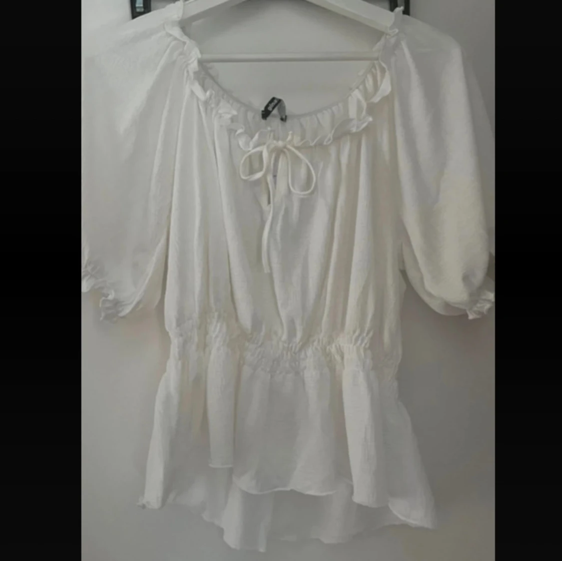 Supersöt vit blus med volangkant och knyt framtill. Blusen har puffiga korta ärmar och resår i midjan. Kan bäras ut off shoulder.