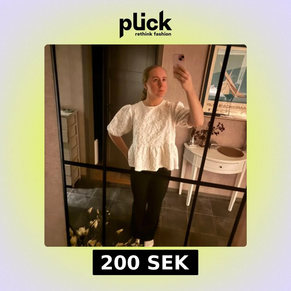 Jättesöt vit blus med puffiga kortärmar och rosetter i ryggen. Blusen har struktur och volang. Står L men skulle säga att den passar M mer