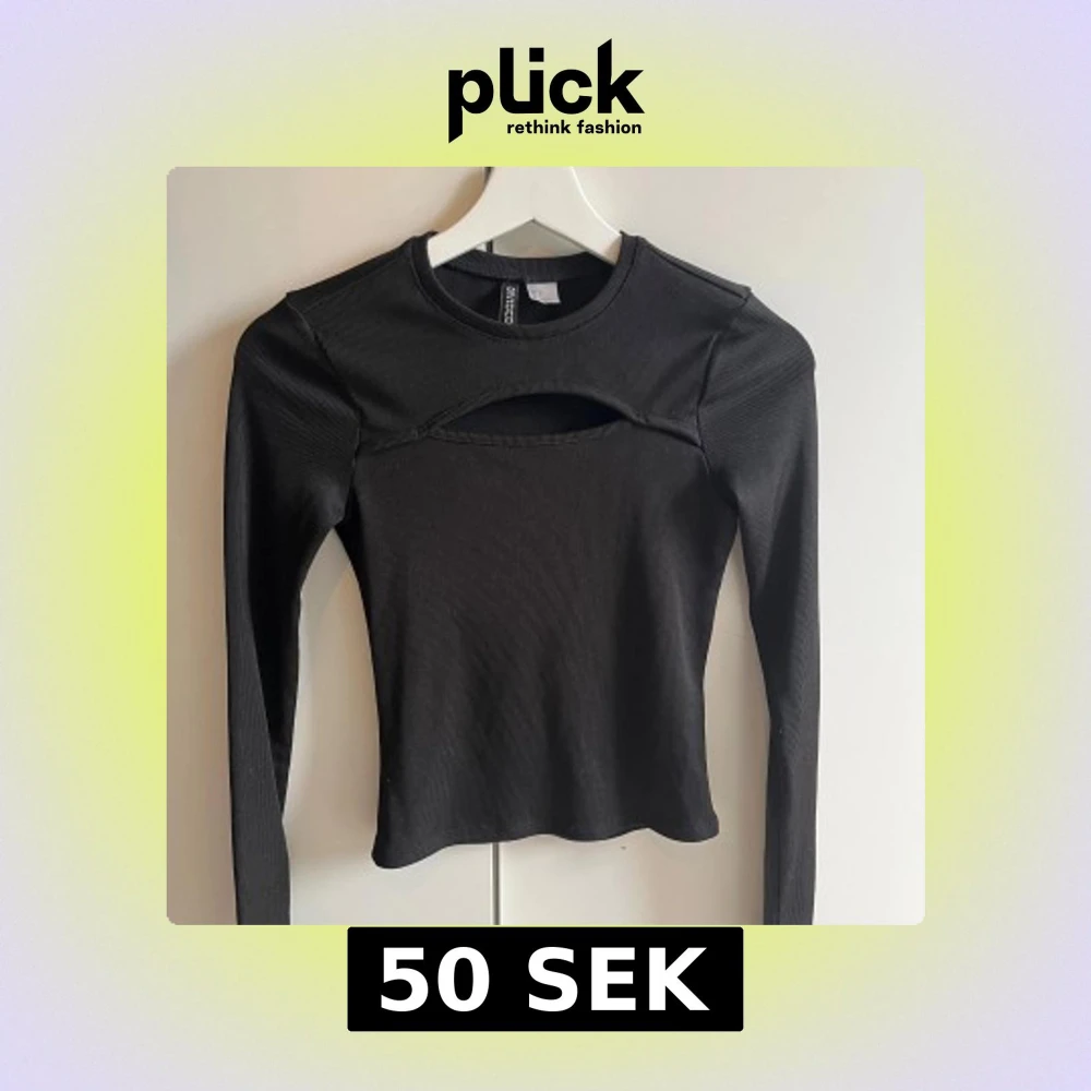 Snygg svart ribbad topp från H&M med en unik cut-out detalj framtill. Toppen har långa ärmar och en tight passform som framhäver figuren. Perfekt för en trendig look!