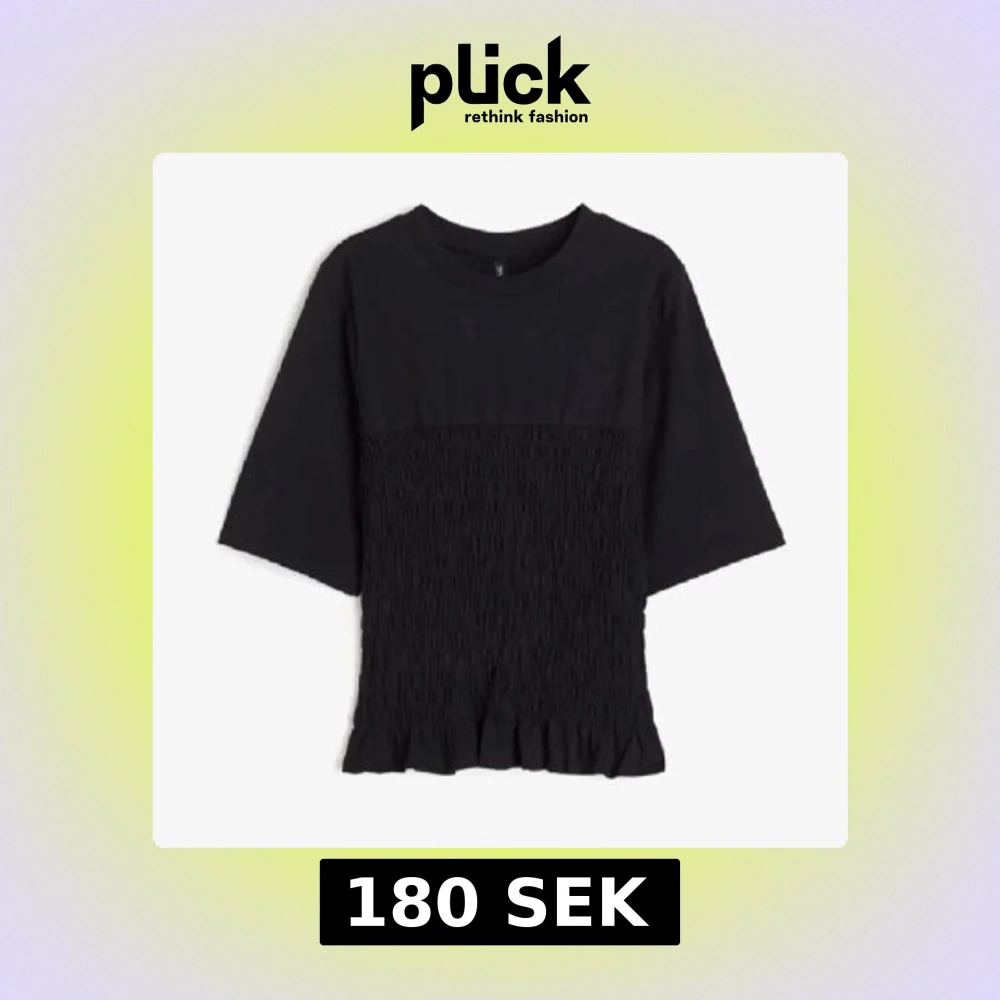 Svart topp med smockad midja och volangkant nertill. Modellen har rund halsringning och halvlånga ärmar. Perfekt för dig som gillar en enkel men ändå trendig look. Pris kan diskuteras 💓