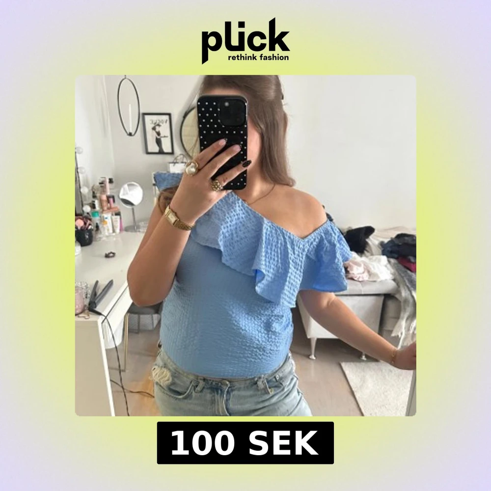 Supersöt ljusblå topp från Lindex med en axel och volangdetalj. Tunt, strukturerat tyg som känns luftigt och perfekt för varma dagar. Sitter snyggt med omlottkänsla. Perfekt att styla med jeans eller kjol.