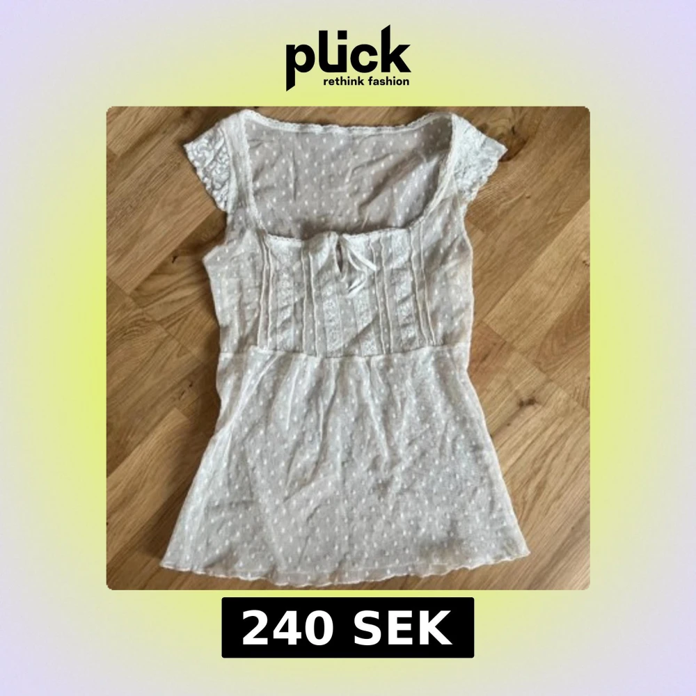 Charmig vit blus med spetsdetaljer och prickigt mönster. Blusen har korta ärmar och en söt knytning framtill. Perfekt för en somrig look!
