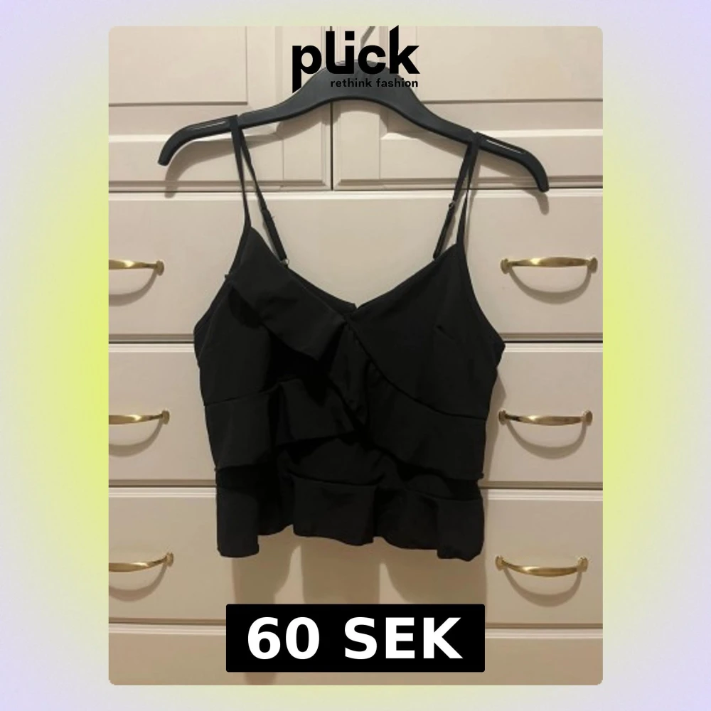 Säljer en svart linnetopp med tunna justerbara axelband och snygga volangdetaljer framtill. Toppen har en croppad passform och är perfekt för dig som gillar en enkel men ändå trendig look.