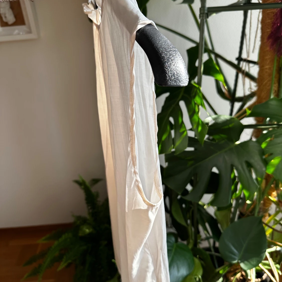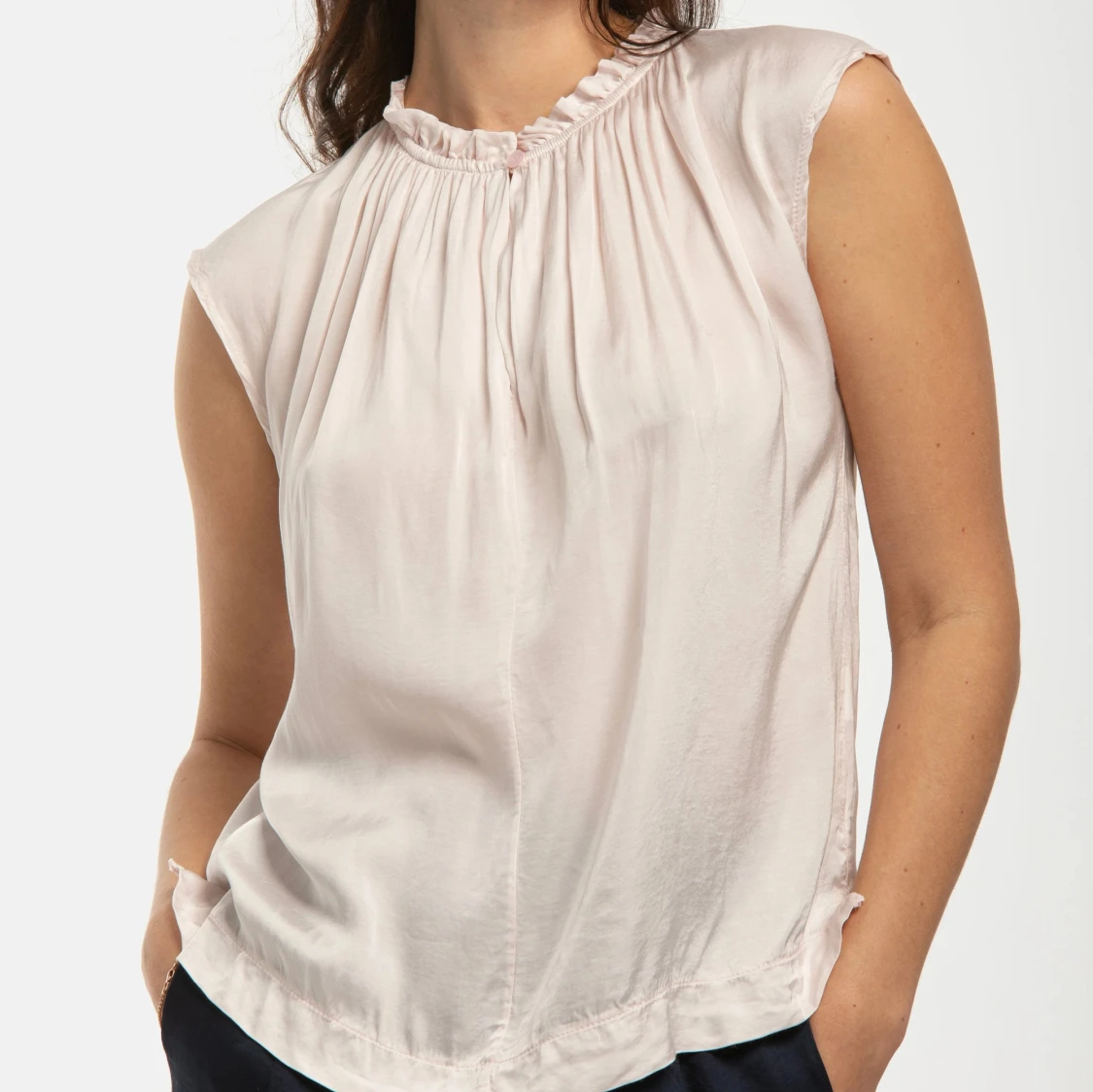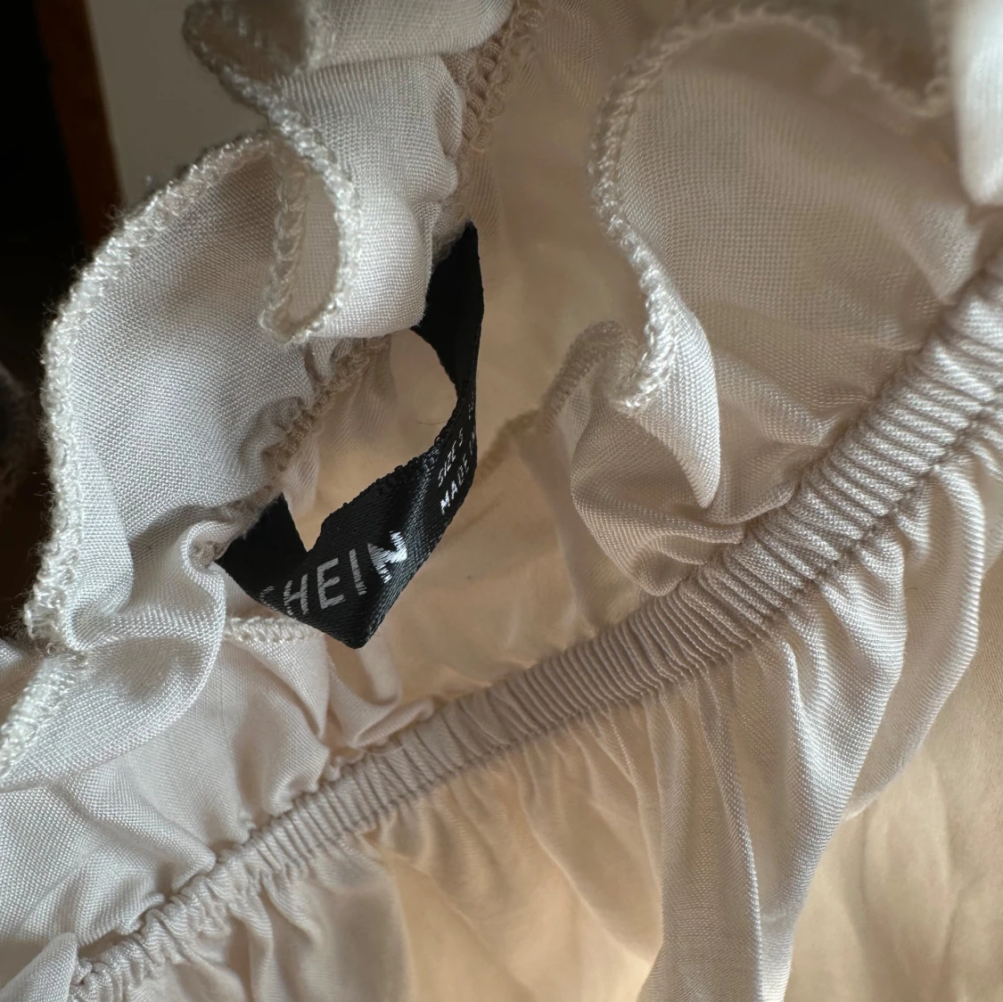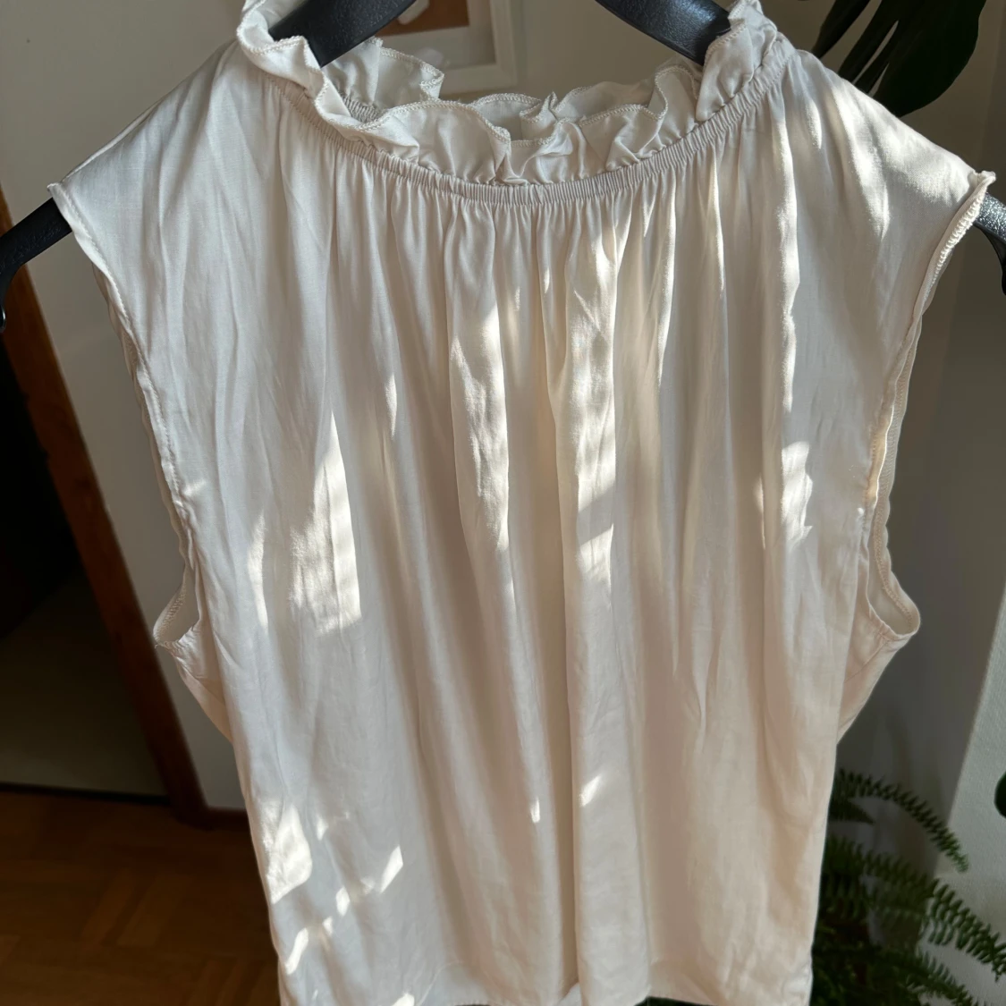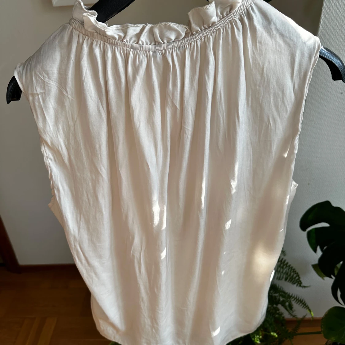 Säljer en söt vit blus med volangdetalj vid halsen. Blusen är ärmlös och har en lös passform med lätt rynkade detaljer upptill. Perfekt för varma dagar eller som ett lager under en kofta. Från Shein storlek 36, endast testad på. Lånad bild!