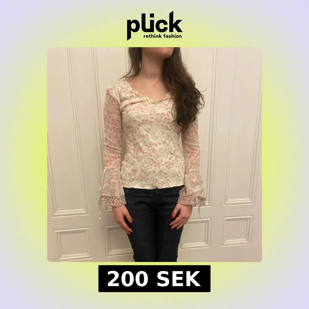 Säljer en söt blommig blus med lång ärm och volangdetaljer. Blusen har en v-ringad hals och är i en ljus beige färg med rosa blommönster.