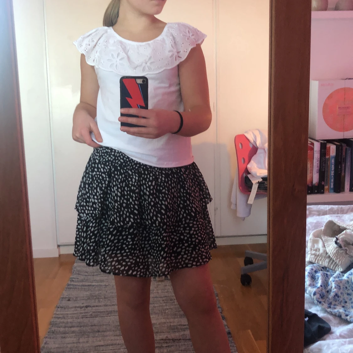 Säljer nu denna fina topp med volang detalj vid halsen. Köpte denna toppen av en annan säljare här på plick och därför vet jag inte vart ifrån den kommer. Den är i fint skick förutom att den har en missfärgning vid armhålan och pytte lite i ryggen, jag kan skicka bild på det privat. Den är i storlek xxs och xs, alltså dubbel storlek. Skriv gärna privat vid förnedringar eller om ni vill ha fler bilder💗