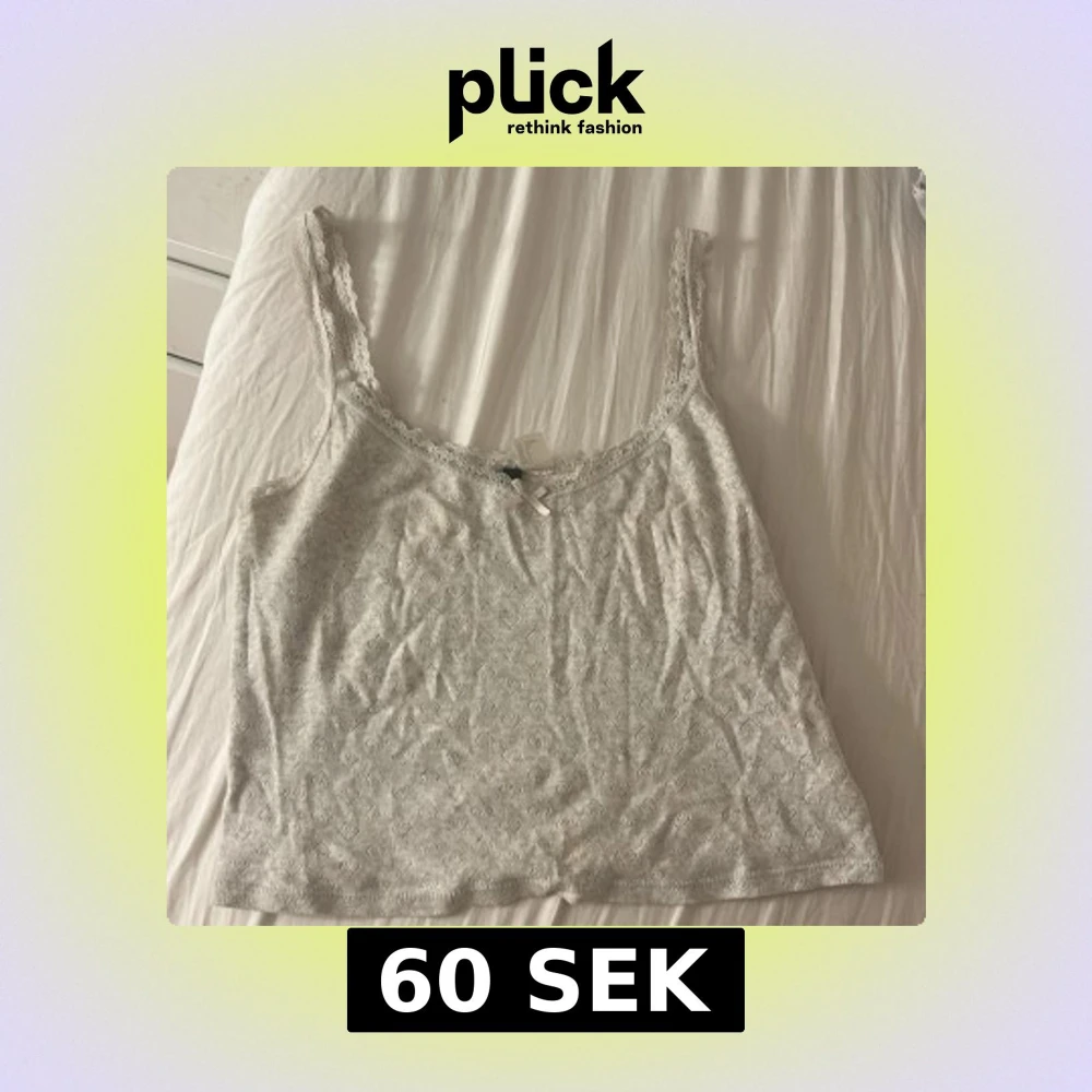 Supersöt vit linnetopp från H&M Divided med spetskant runt axelband och halsringning. Toppen har en liten rosett framtill och är ribbad med diskret hålmönster. Perfekt för lager-på-lager eller sommaroutfits.