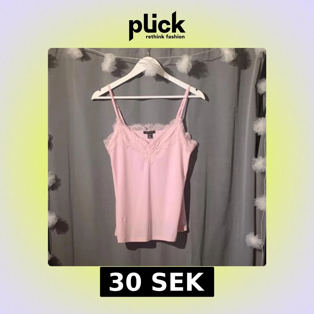 Supersöt ljusrosa topp från Amisu med tunna axelband och v-ringning dekorerad med spets. Endast använd en gång!