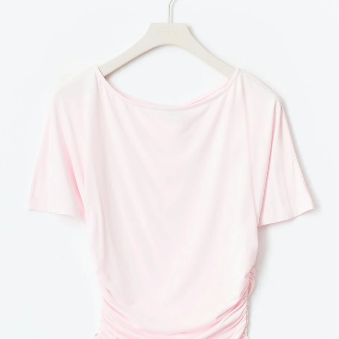 Säljer en ljusrosa offshoulder topp med kort ärm och tight passform. Toppen har rynkade detaljer i midjan och är tillverkad i ett mjukt, stretchigt material. Aldrig använt och helt slutsåld överallt❤️