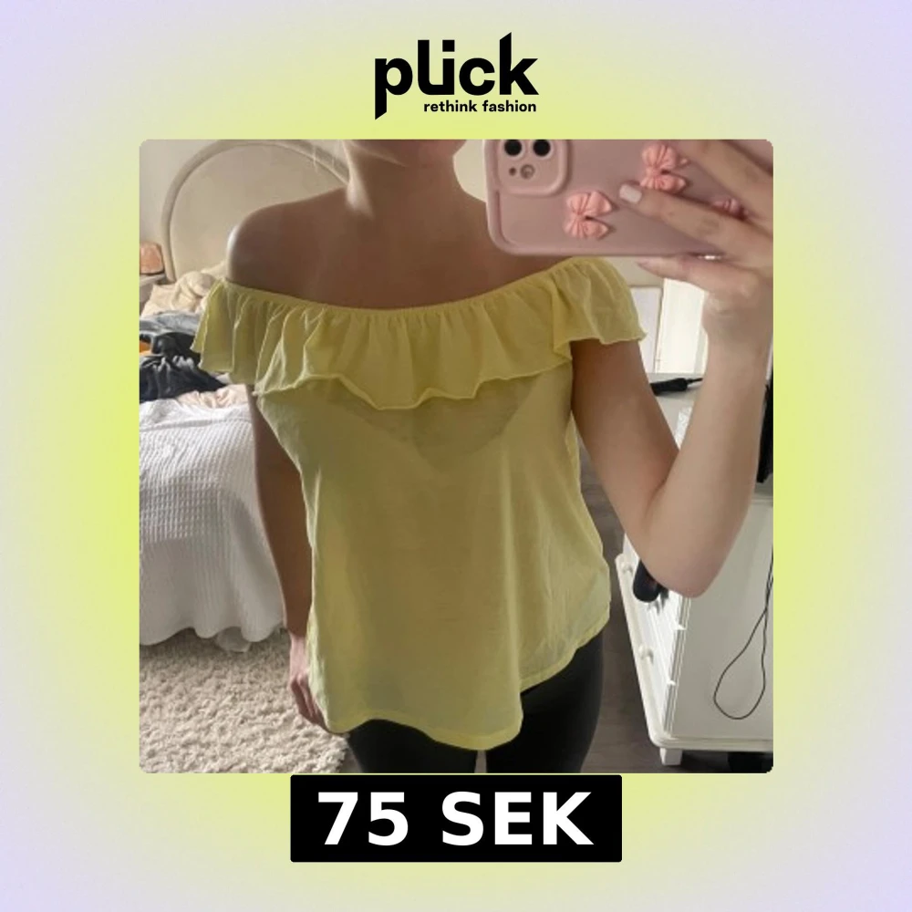 Säljer en söt gul offshoulder topp med volang. Super fin citron-gul färg!