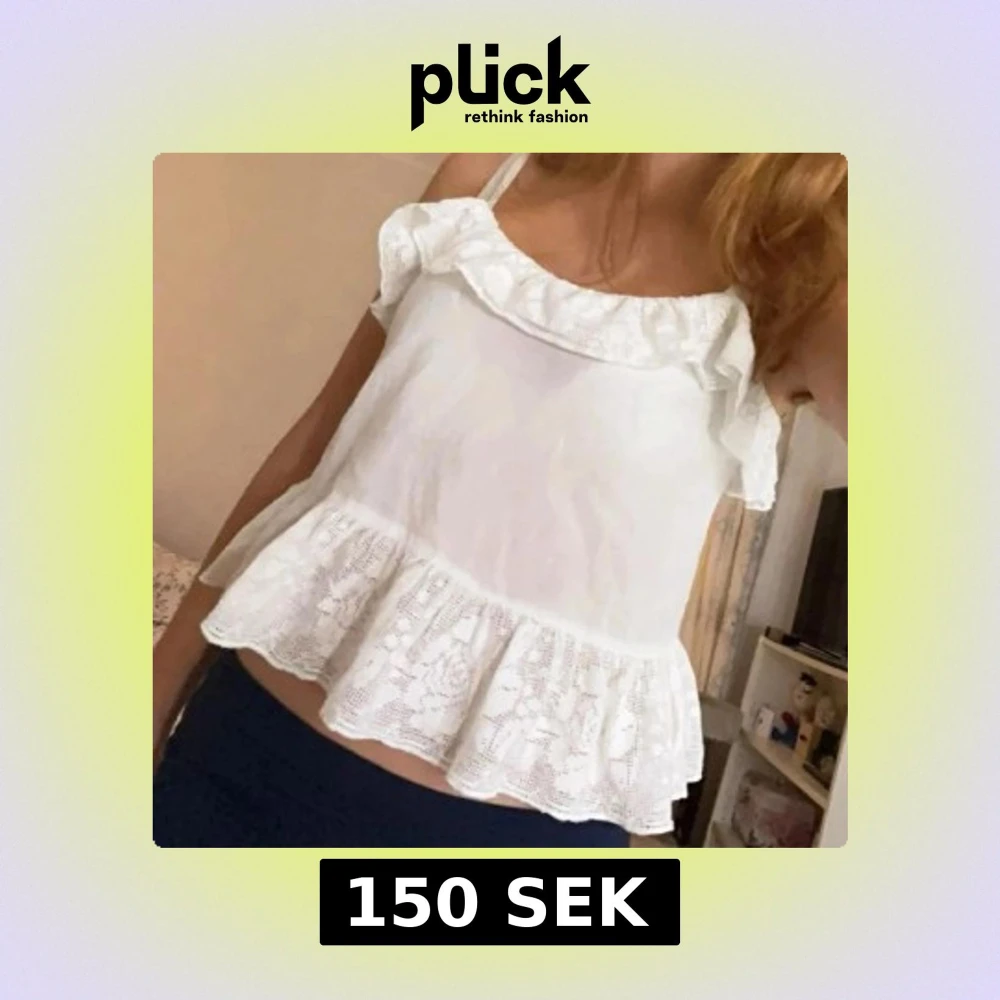 Säljer en söt vit ärmlös topp med volangdetaljer. Toppen har en luftig passform och är perfekt för varma sommardagar. Den har en romantisk känsla med sina spetsdetaljer vid fållen. Perfekt att matcha med jeans eller kjol för en avslappnad look.