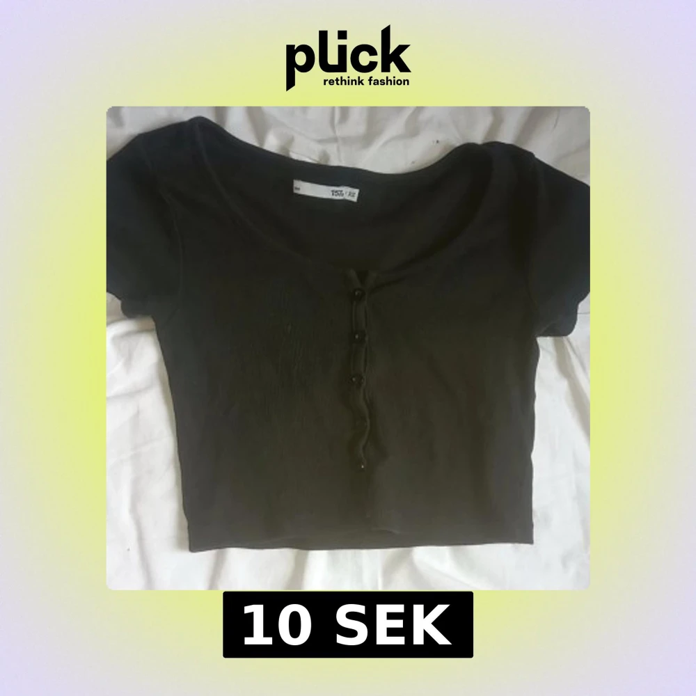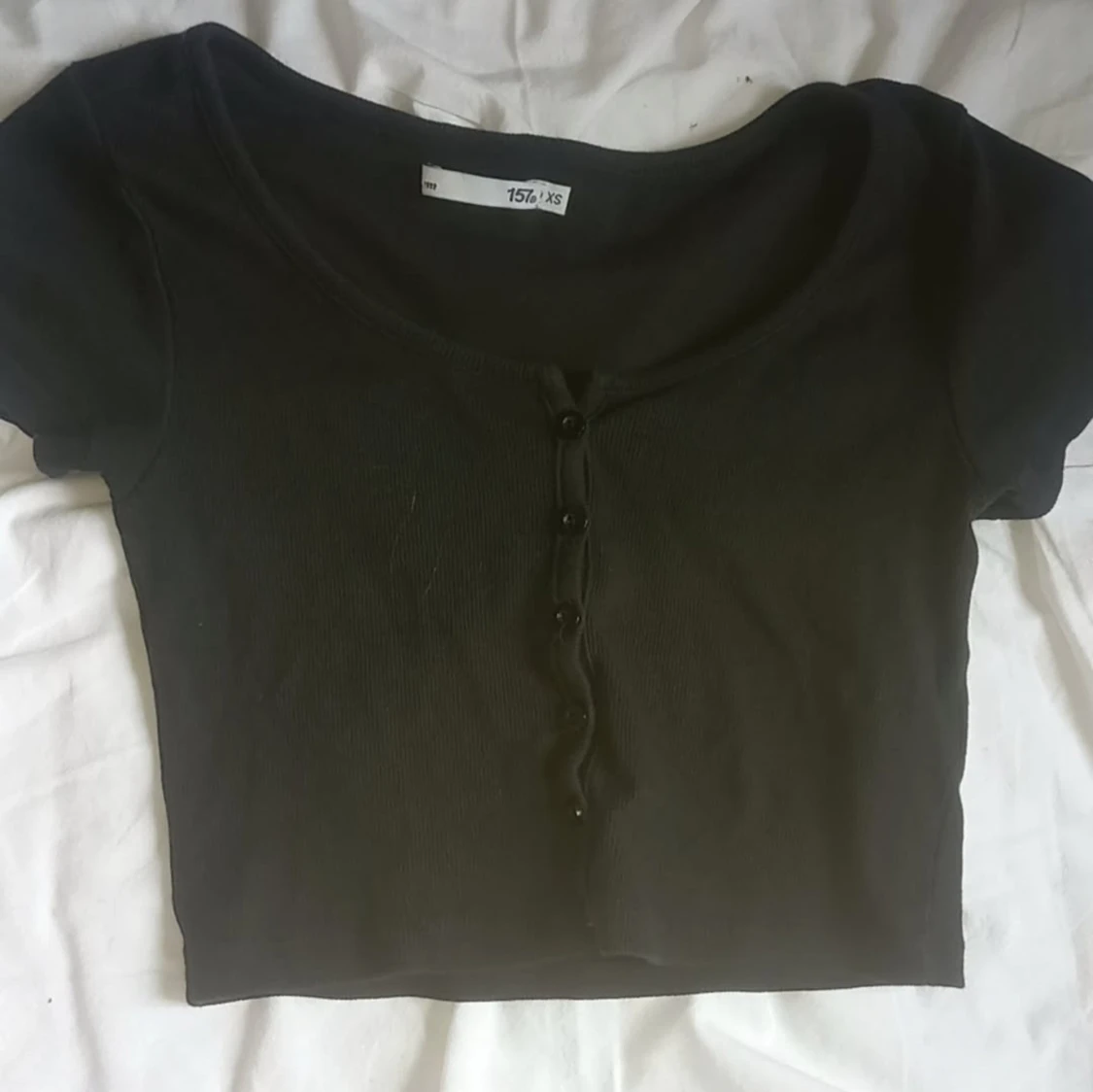 Säljer en svart croppad topp med korta ärmar och knappar framtill. Toppen har en rundad halsringning och är tillverkad i ett ribbat material som ger en snygg passform.