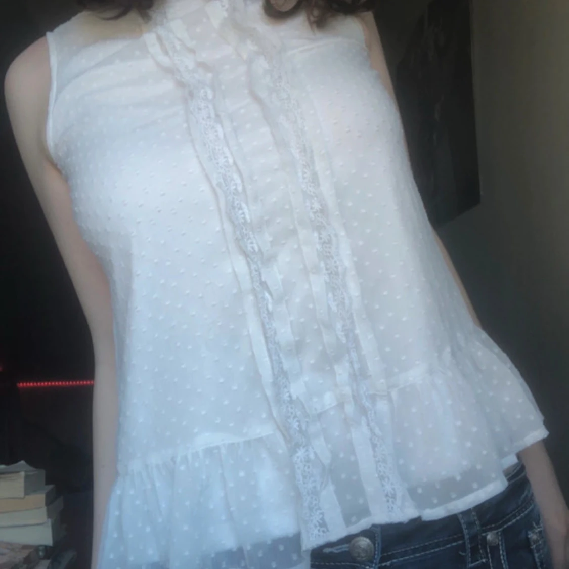 Supersöt vit blus i transparent tyg med små prickar, volang nertill och spets längs knäppningen framtill.
