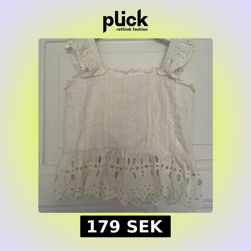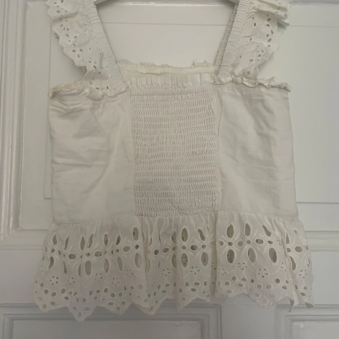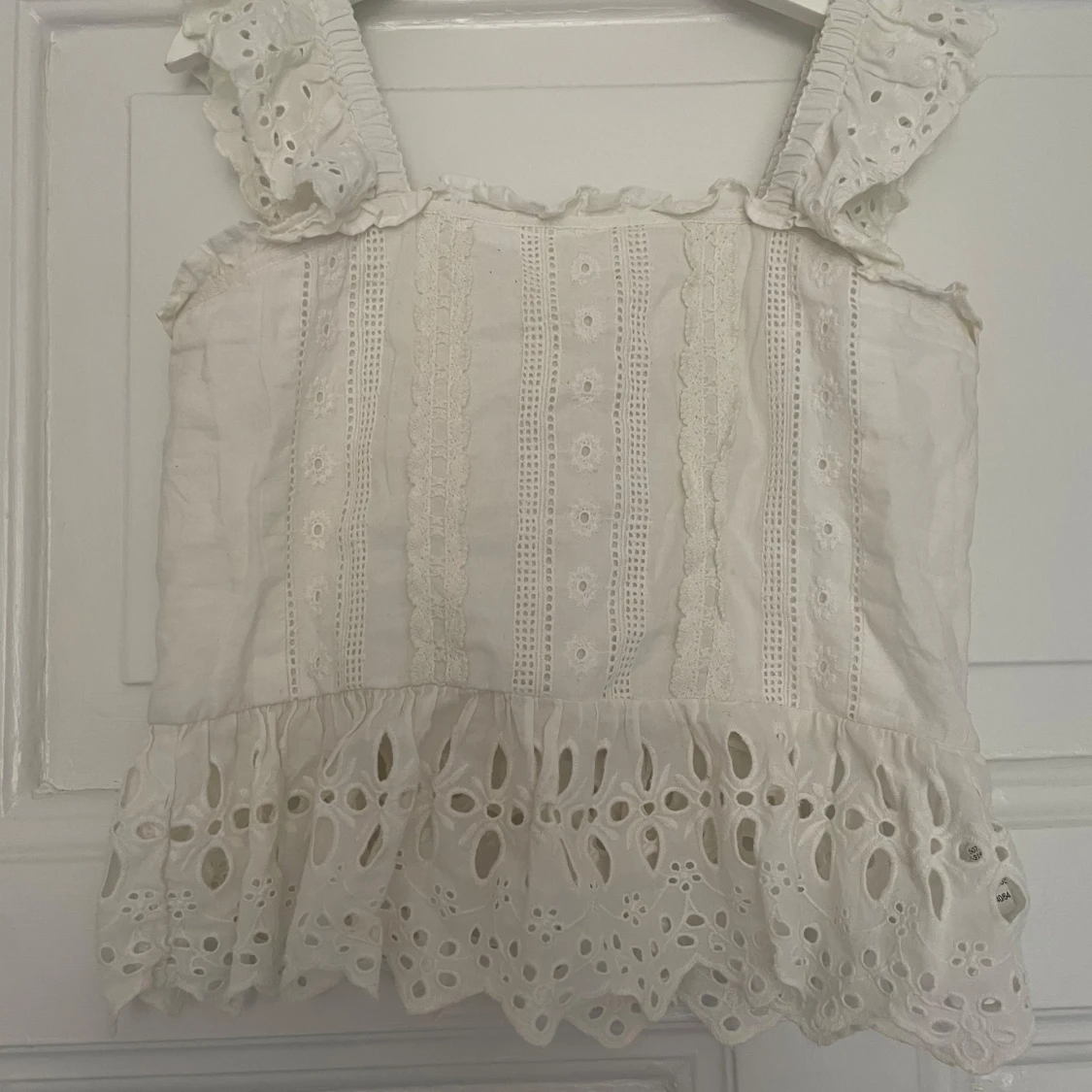 Supersöt vit blus med breda axelband och broderade detaljer. Toppen har volangkant nertill och spetsmönster längs hela plagget. Axelbanden är dekorerade med hålbroderi och den här är asfin att ha både till jeans eller till finkjol! Säljer för 179, nypris 250 💗