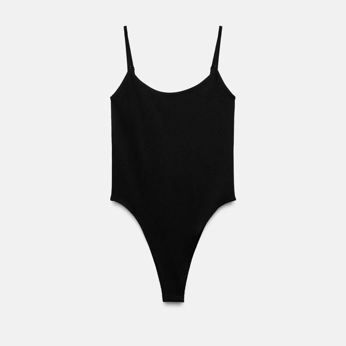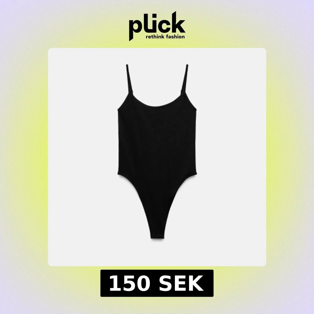 Svart body med smala axelband och rundad halsringning. Sitter tight och har högt skurna ben, perfekt att styla med jeans eller kjol. Enkel och stilren design som funkar till många looks. Bodyn är från Zara och är i storlek xs/s.