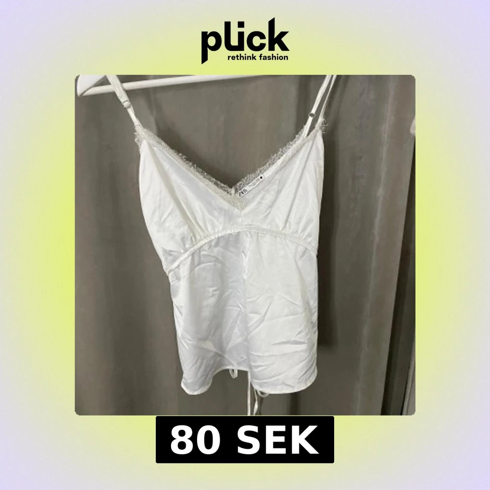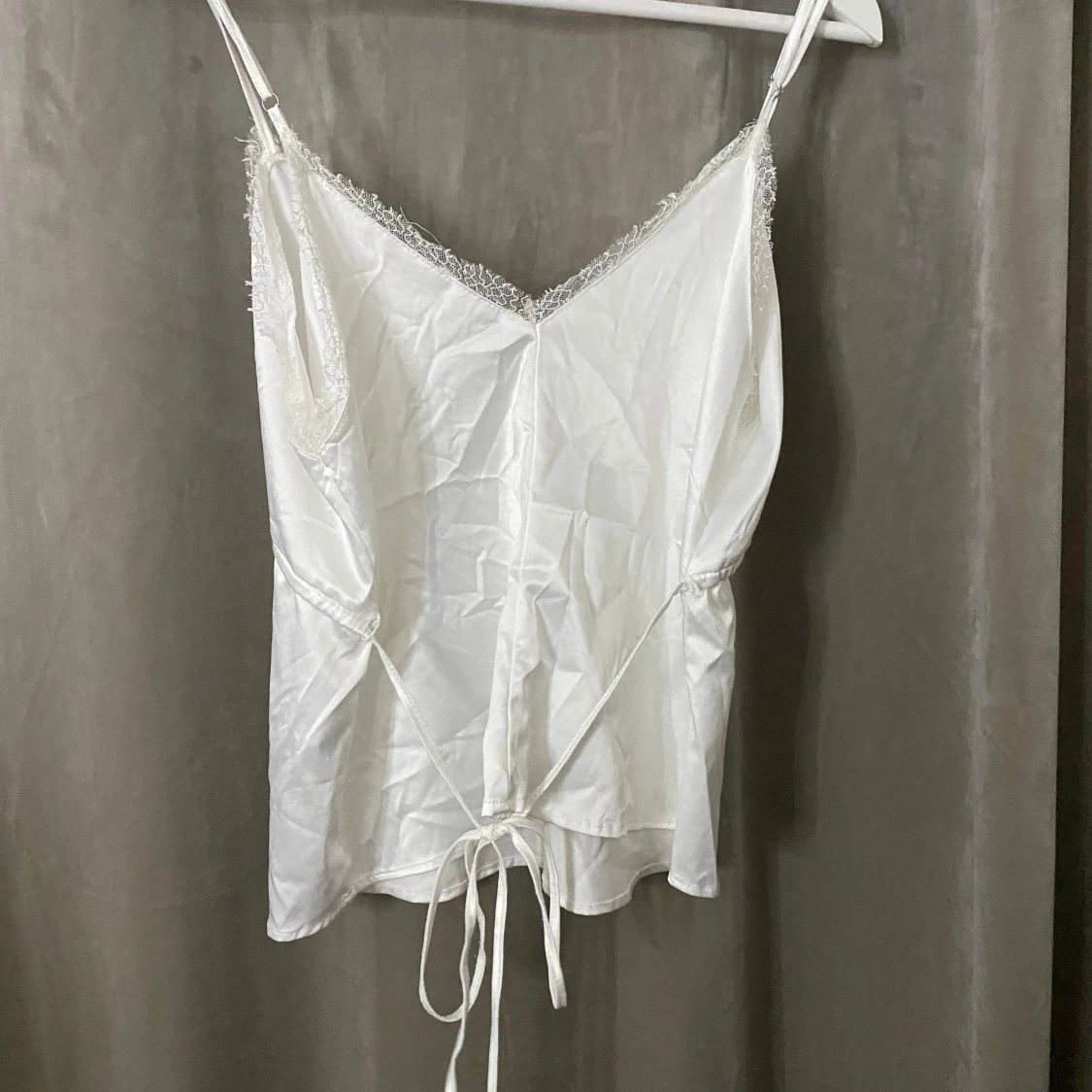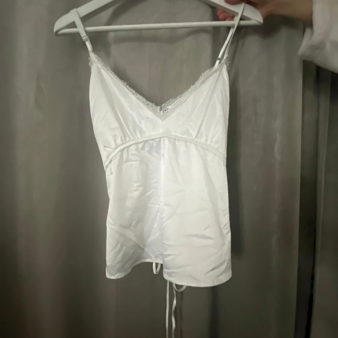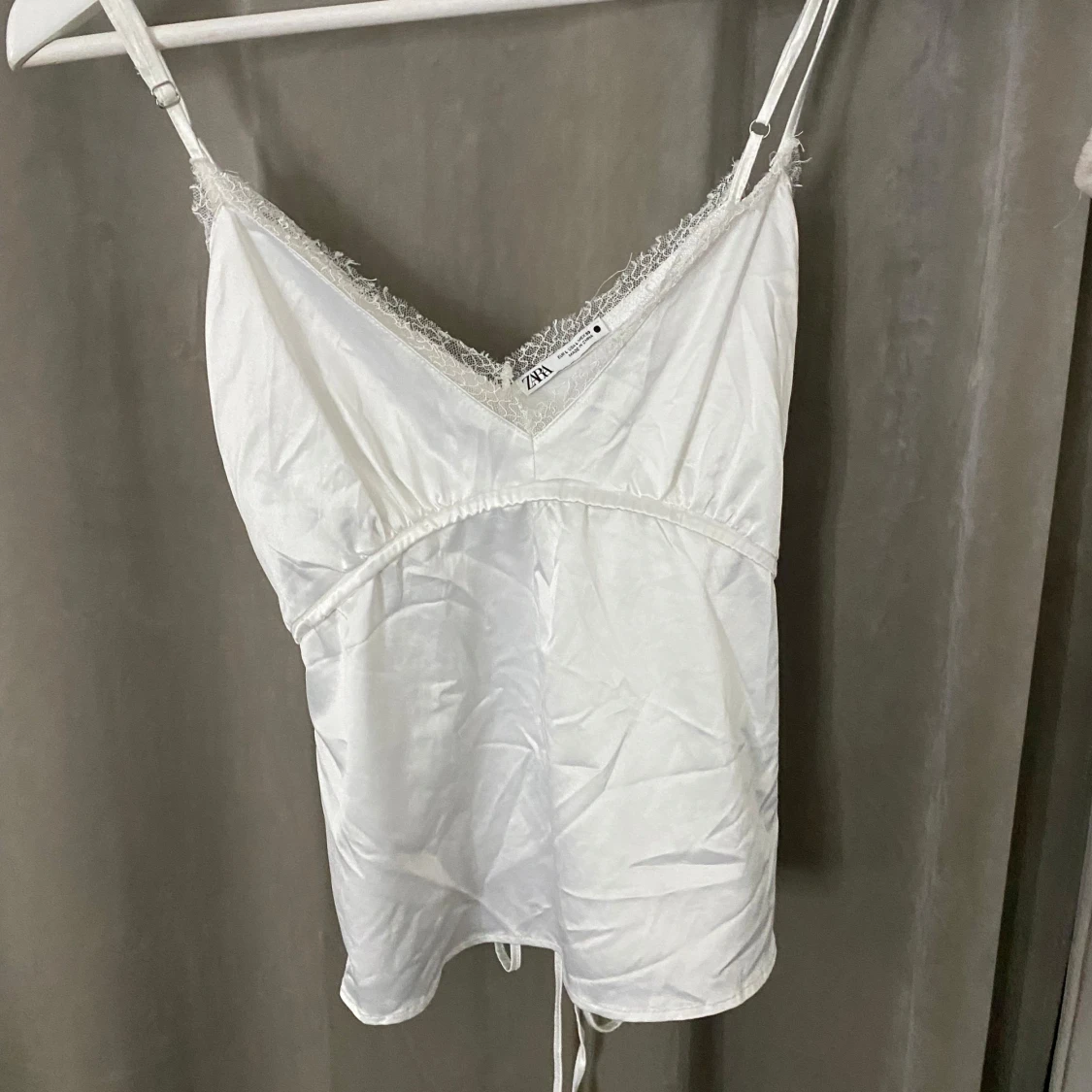 Supersöt vit linnetopp i satin från Zara med tunna axelband och v-ringning dekorerad med spets. Toppen har justerbara band och snygg knytning i ryggen för extra detalj. Perfekt att styla med jeans eller kjol för en trendig look.