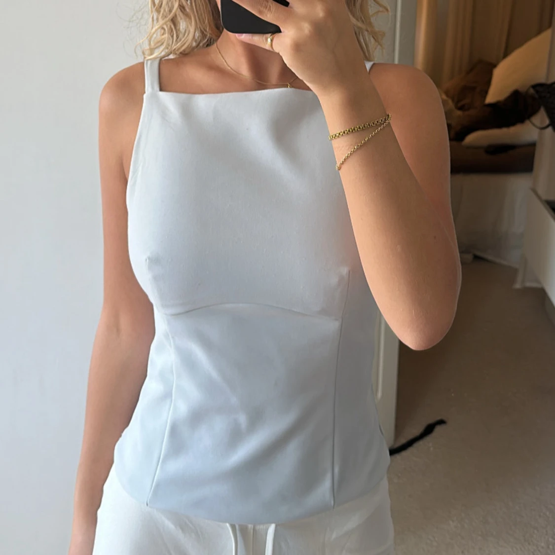 Supersnygg vit korsettopp med raka linjer och breda axelband. Toppen har tre söta rosetter i ryggen som ger en unik och trendig look. Figurnära passform och stilren design, perfekt att styla med jeans eller kjol. Materialet känns slätt och lätt.