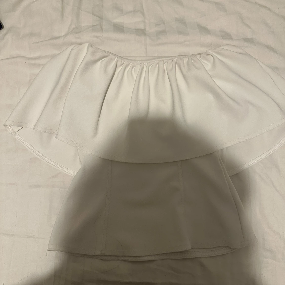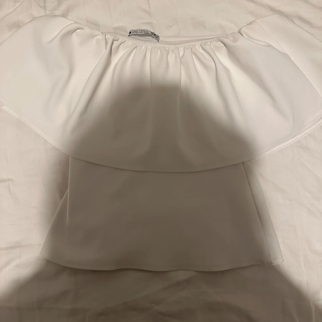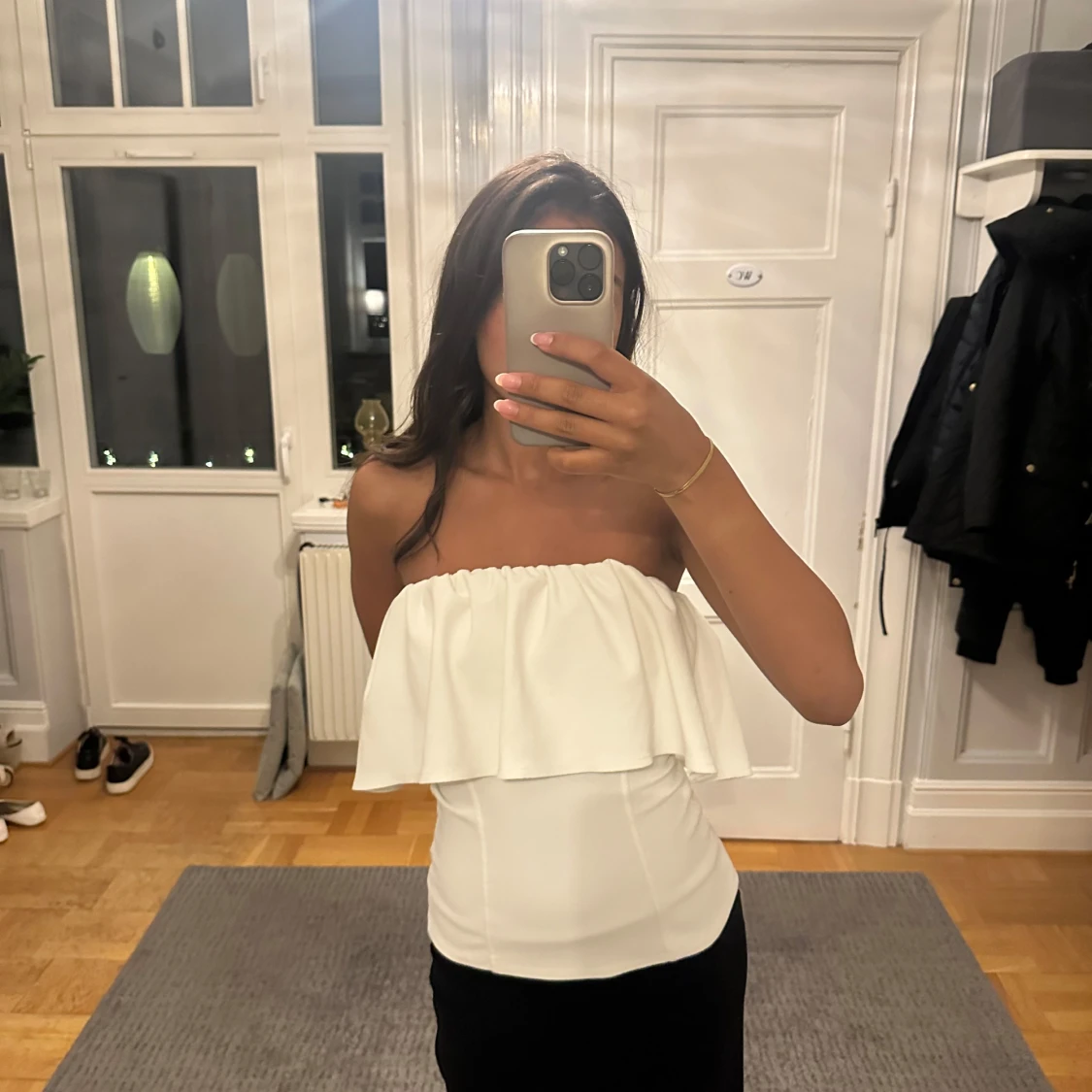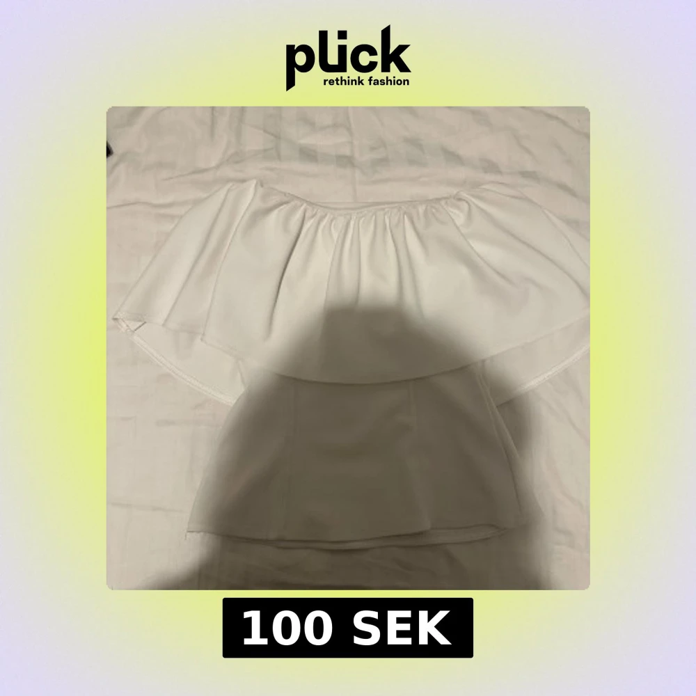 Säljer min vita, trendiga volangtopp🌟Det kan finnas spår av smink högst upp längst kanten men det är inget som syns när den används. Om tröjan säljs så kommer jag såklart att försöka få bort de små spåren och jag tror att det är möjligt!