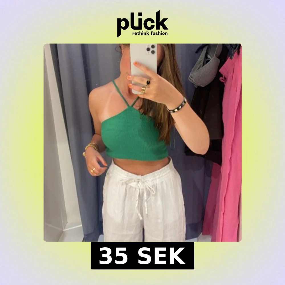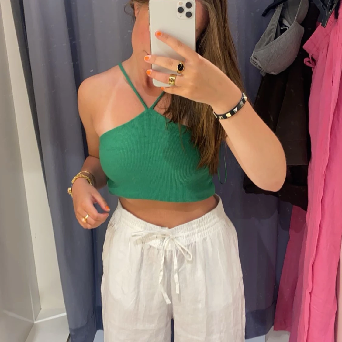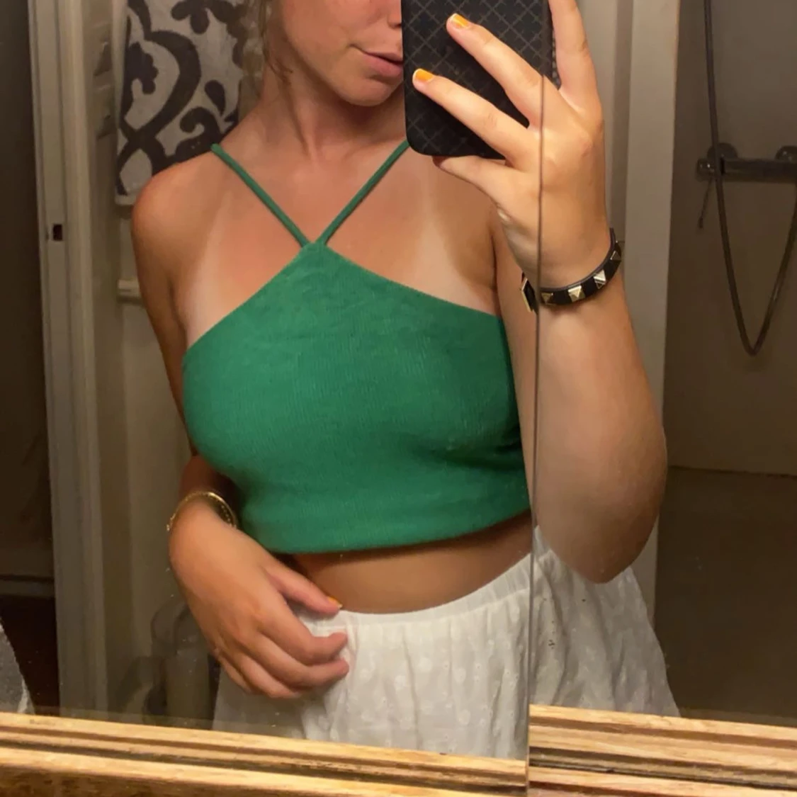 Snygg grön croppad linnetopp med smala axelband. Perfekt grön nyans, endast använd en gång, så otroligt bra skick, säljer för den inte kommer till användning. På bilden har jag vikt upp den lite, men kan ha den så den täcker ner till naveln med.