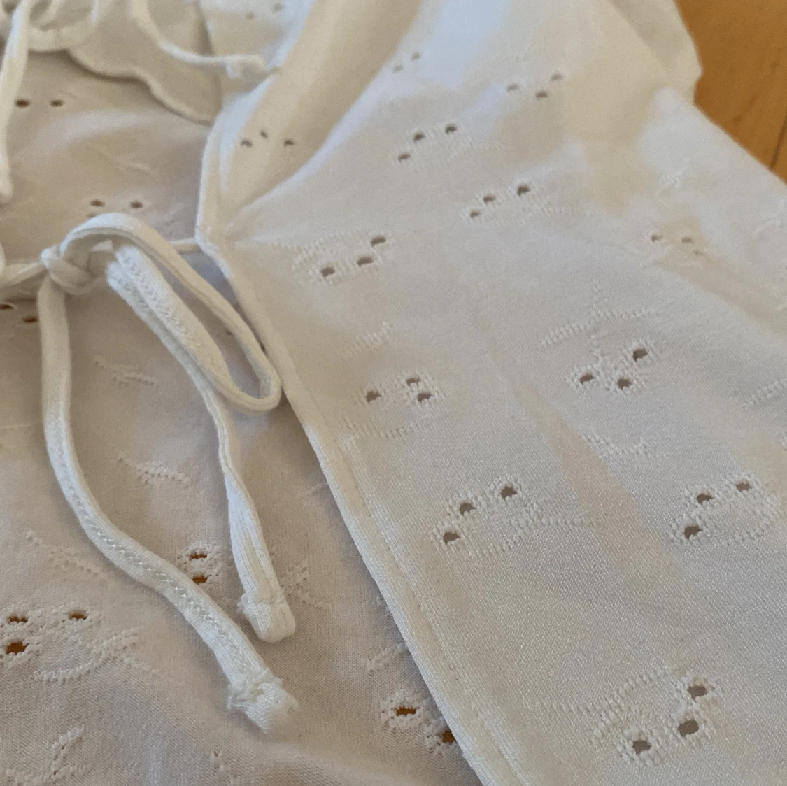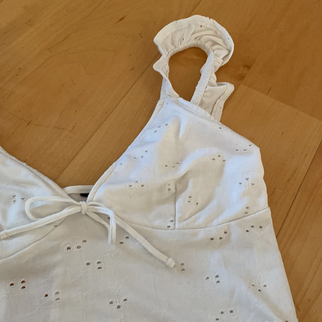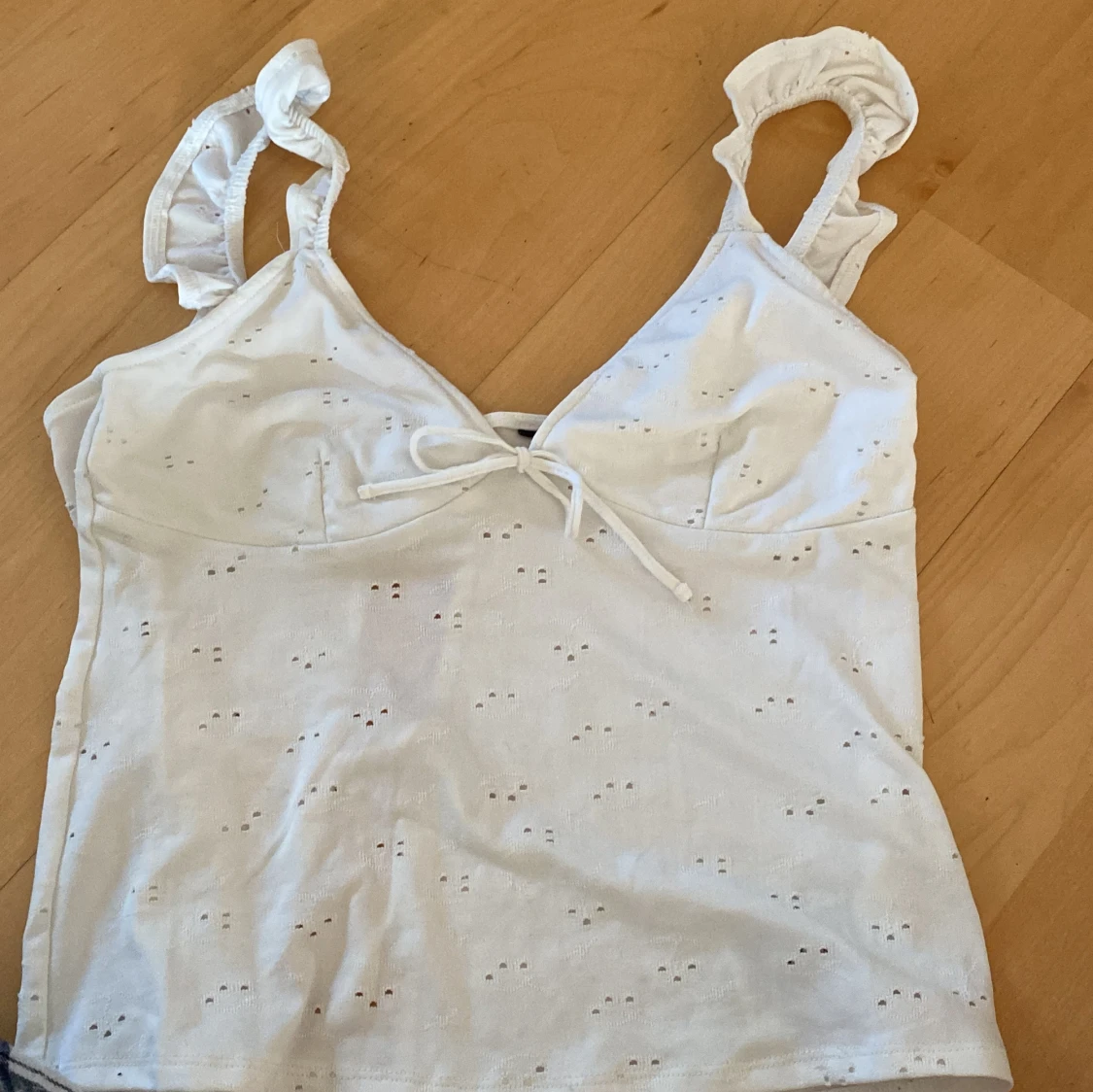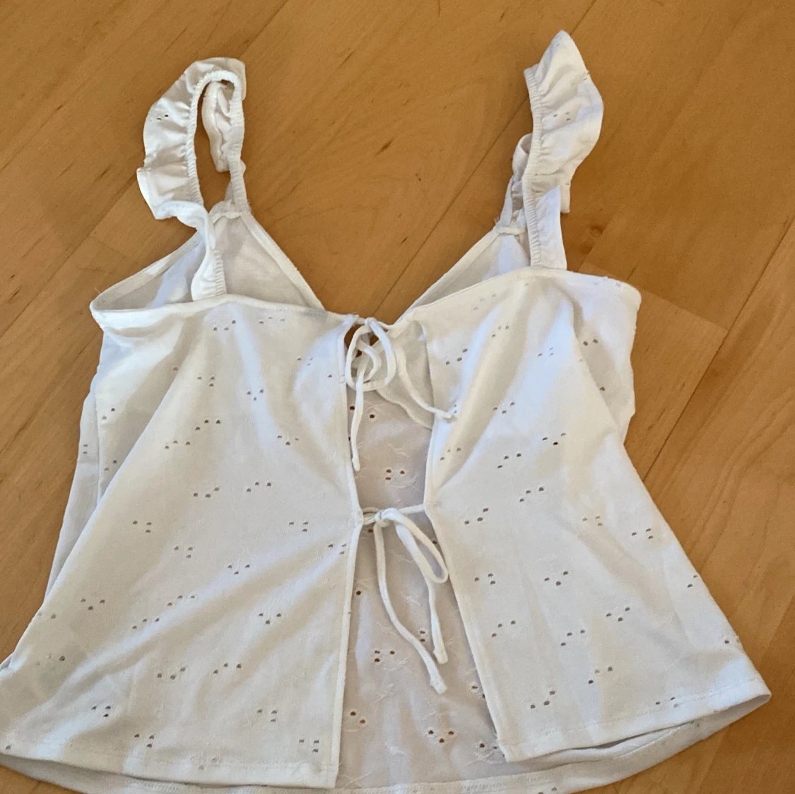Vitt sommarlinne men volang axelband.