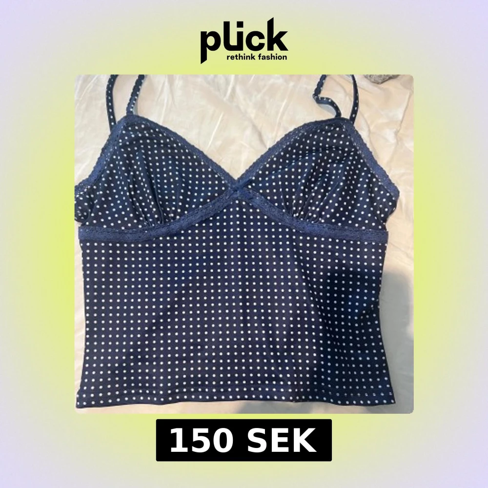 Supersöt mörkblå topp med vita prickar och tunna axelband. Aldrig använt! Skriv för mer frågor💕skulle säga att storleken är M men passar S