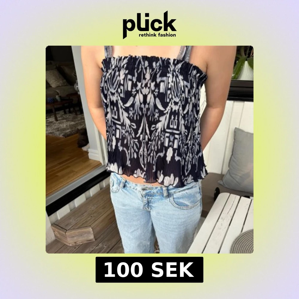 Säljer en luftig linnetopp med smala axelband. Toppen är marinblå med vitt mönster och har en lätt rynkad kant upptill och nertill. Perfekt för varma dagar och enkel att styla med jeans eller kjol.💕
