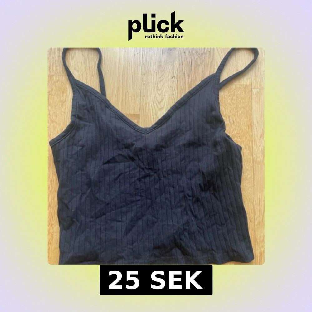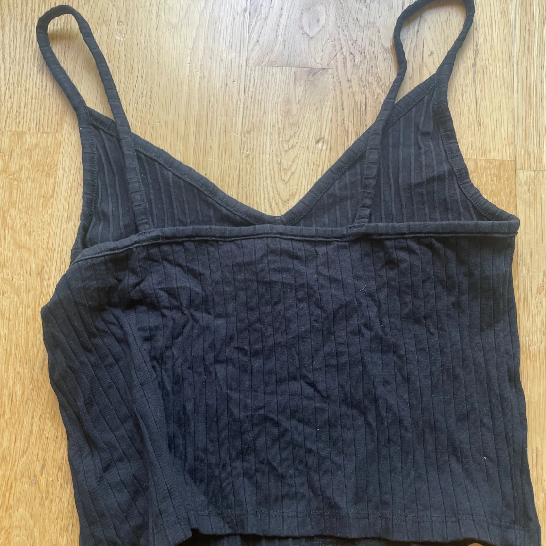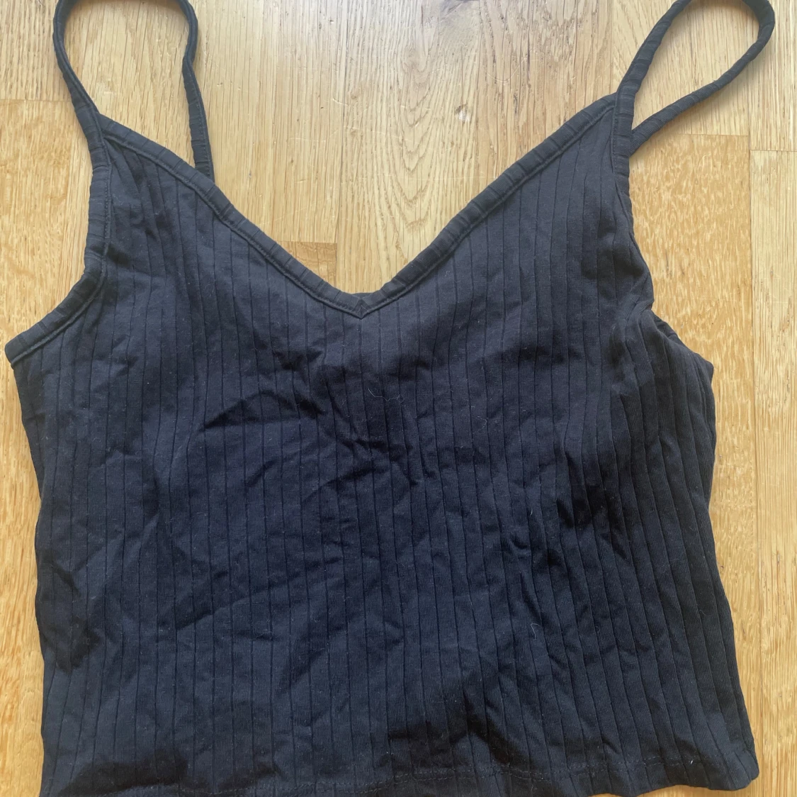 Svart ribbad linnetopp från H&M Divided med smala axelband och v-ringning. Super bekväm och passar bra nu i varmt väder!