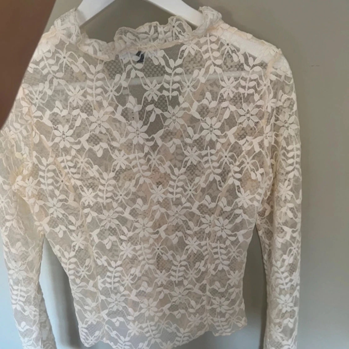Säljer en elegant vit spetsblus från Venderbys med långa ärmar och v-ringning. Blusen har fina volangdetaljer framtill och knytning vid bysten. Perfekt för dig som gillar romantisk stil och transparenta material.