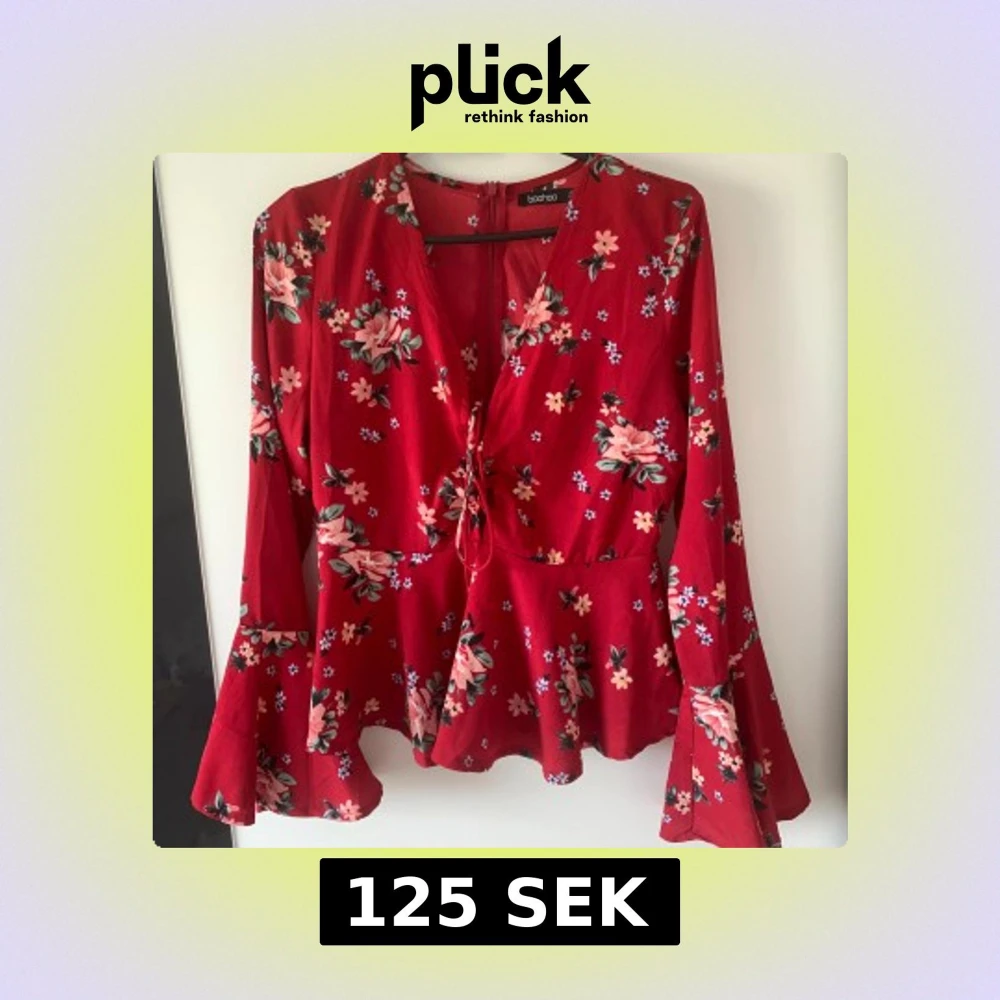Supersöt röd blus från Boohoo med blommigt mönster i rosa och grönt. Blusen har v-ringning med snörning framtill och långa trumpetärmar som ger en extra cool vibe. Perfekt för dig som vill sticka ut lite extra med färg och mönster.