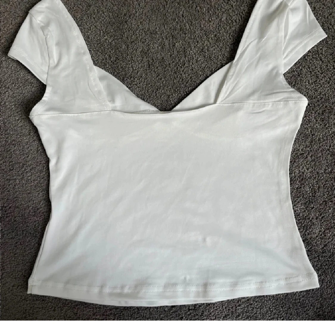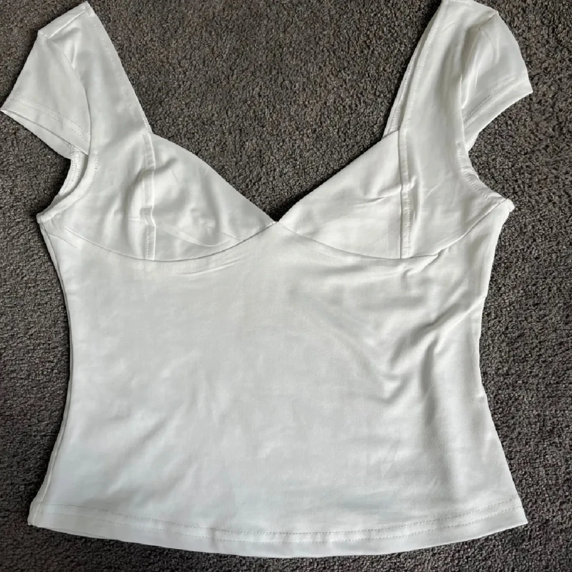 Snygg vit topp med v-ringning och korta ärmar. Figurnära passform och lätt stretchigt material som känns mjukt mot huden. Perfekt att styla med jeans eller kjol för en clean look.