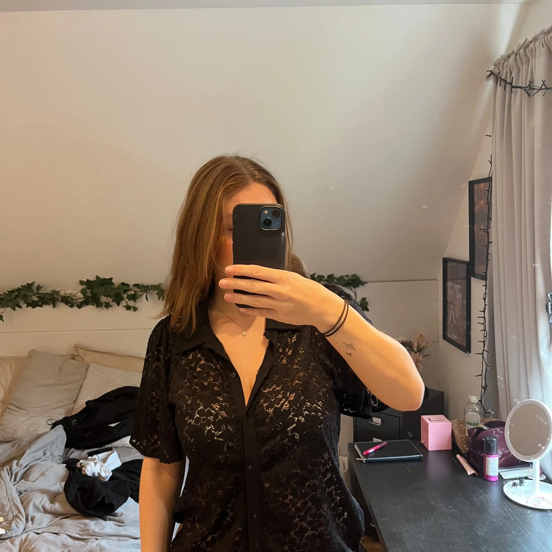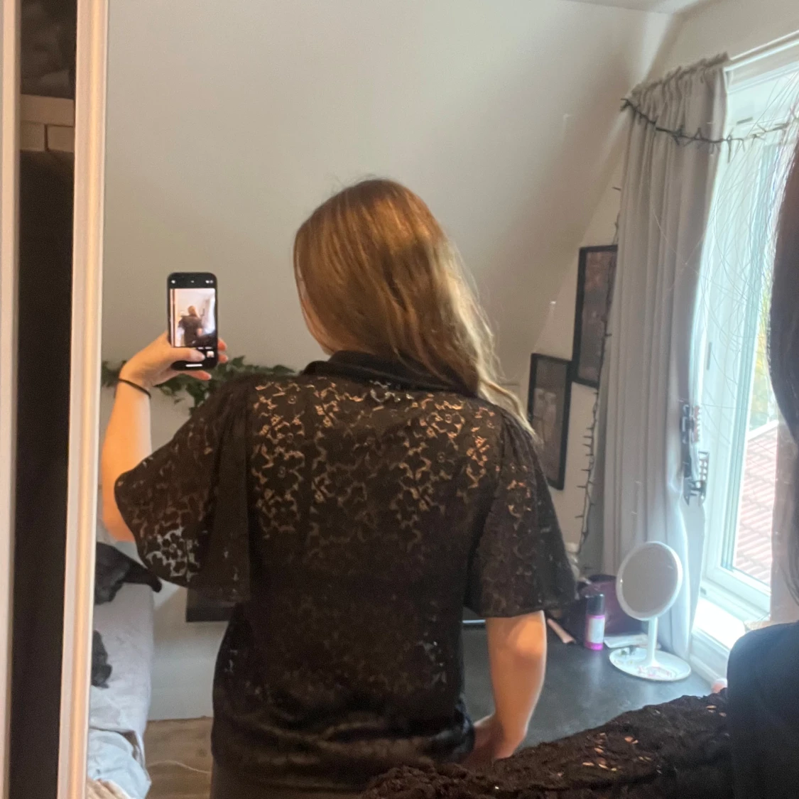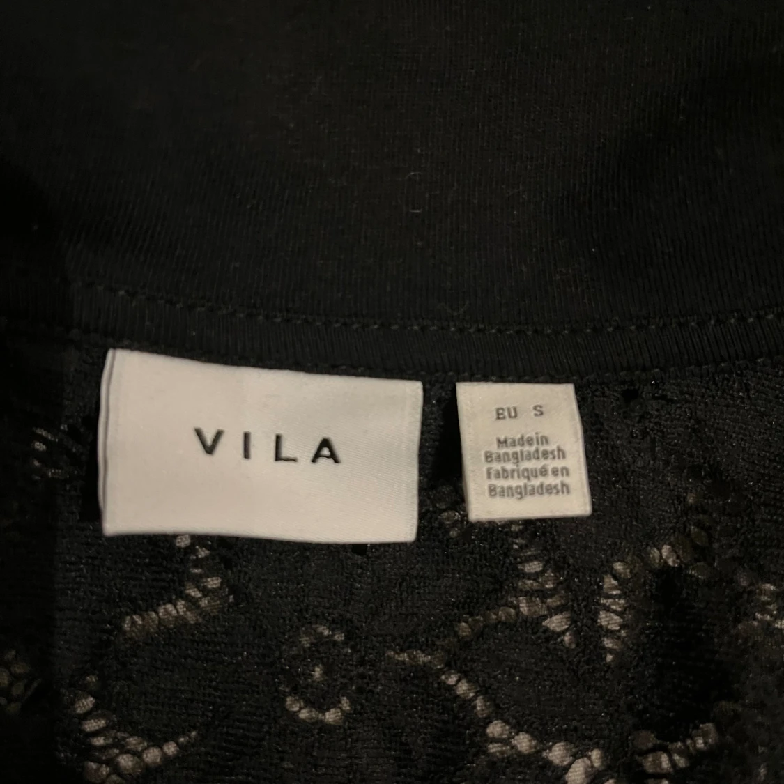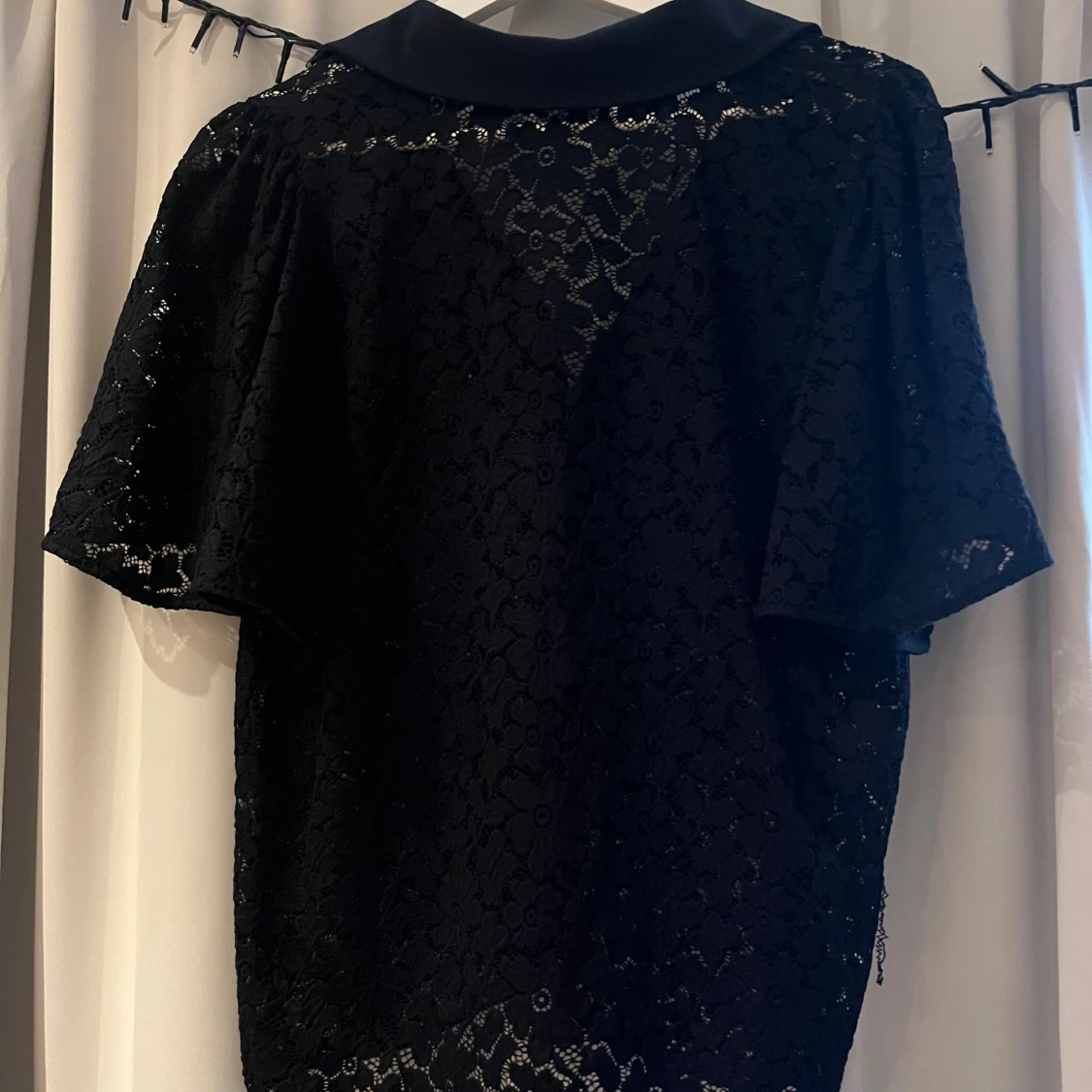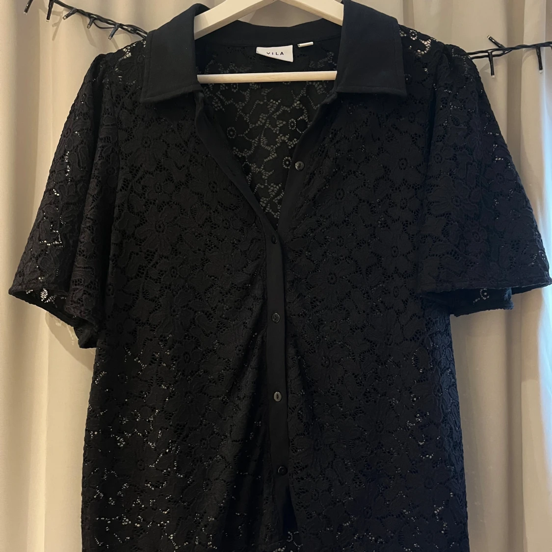 Svart kortärmad skjorta från Vila i genombruten spets med blommigt mönster. Klassisk krage, knäppning framtill och loose fit. Ärmarna är utsvängda.