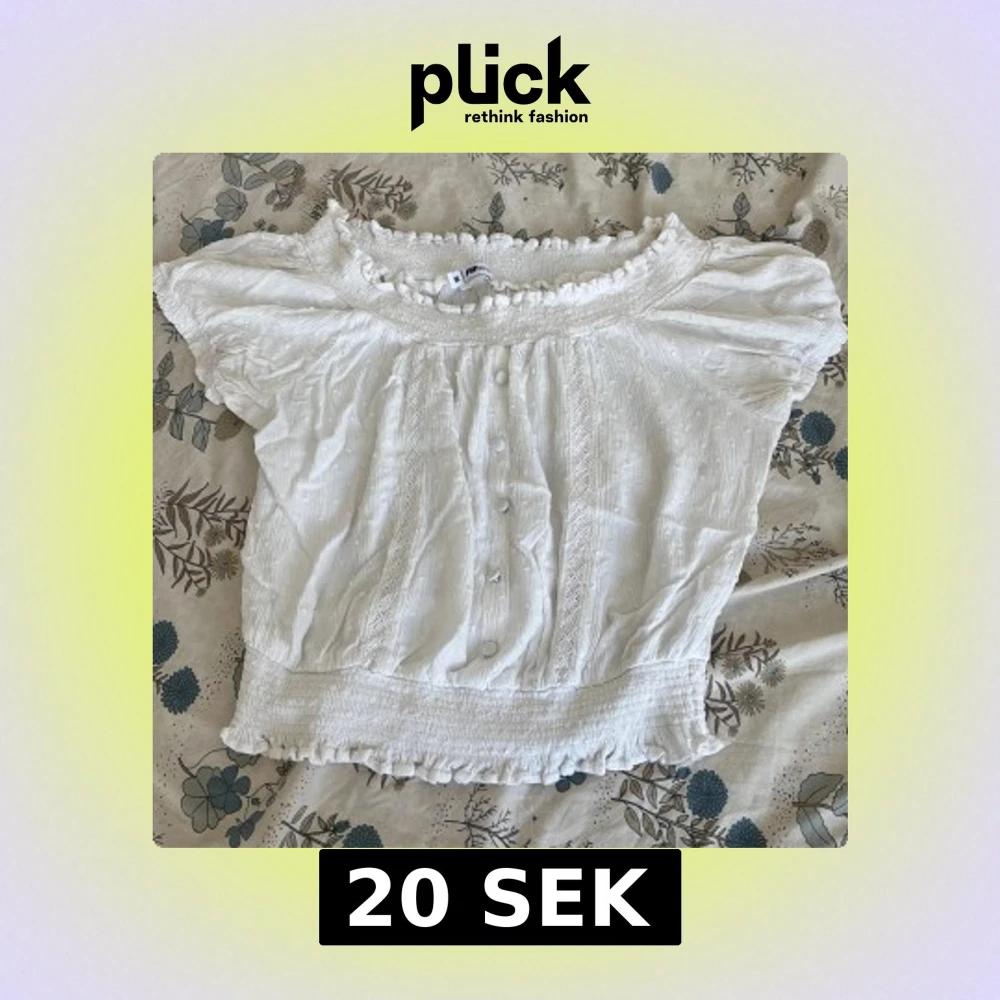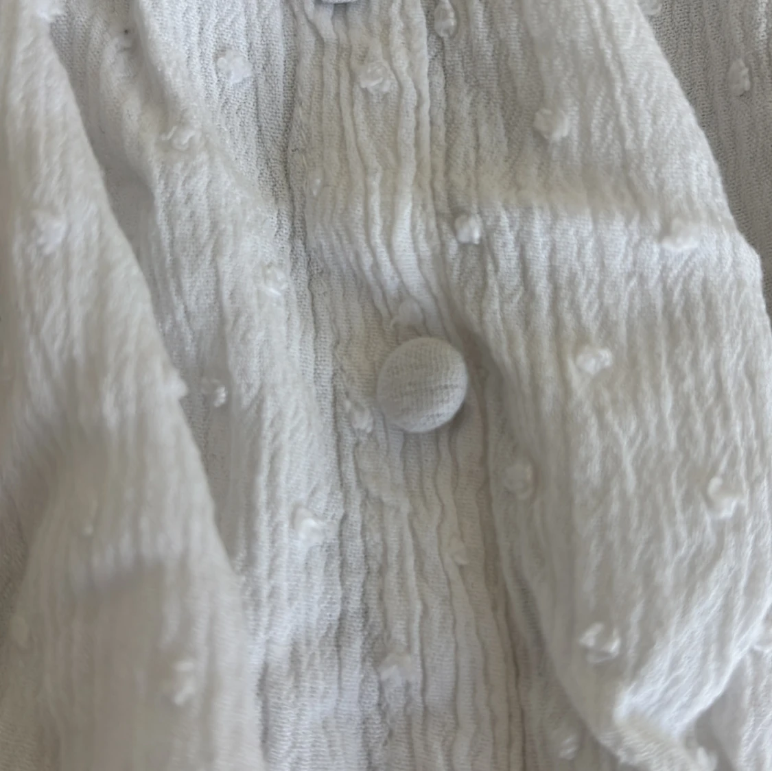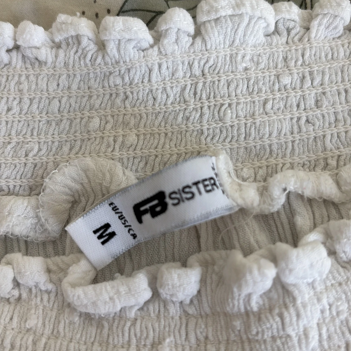 Supersöt vit blus från FB Sister med korta ärmar, volangdetaljer vid hals och nederkant samt knappar framtill. Toppens tyg har diskret struktur och små prickar, och den har smockad midja för en snygg passform. Perfekt för dig som gillar romantisk stil.