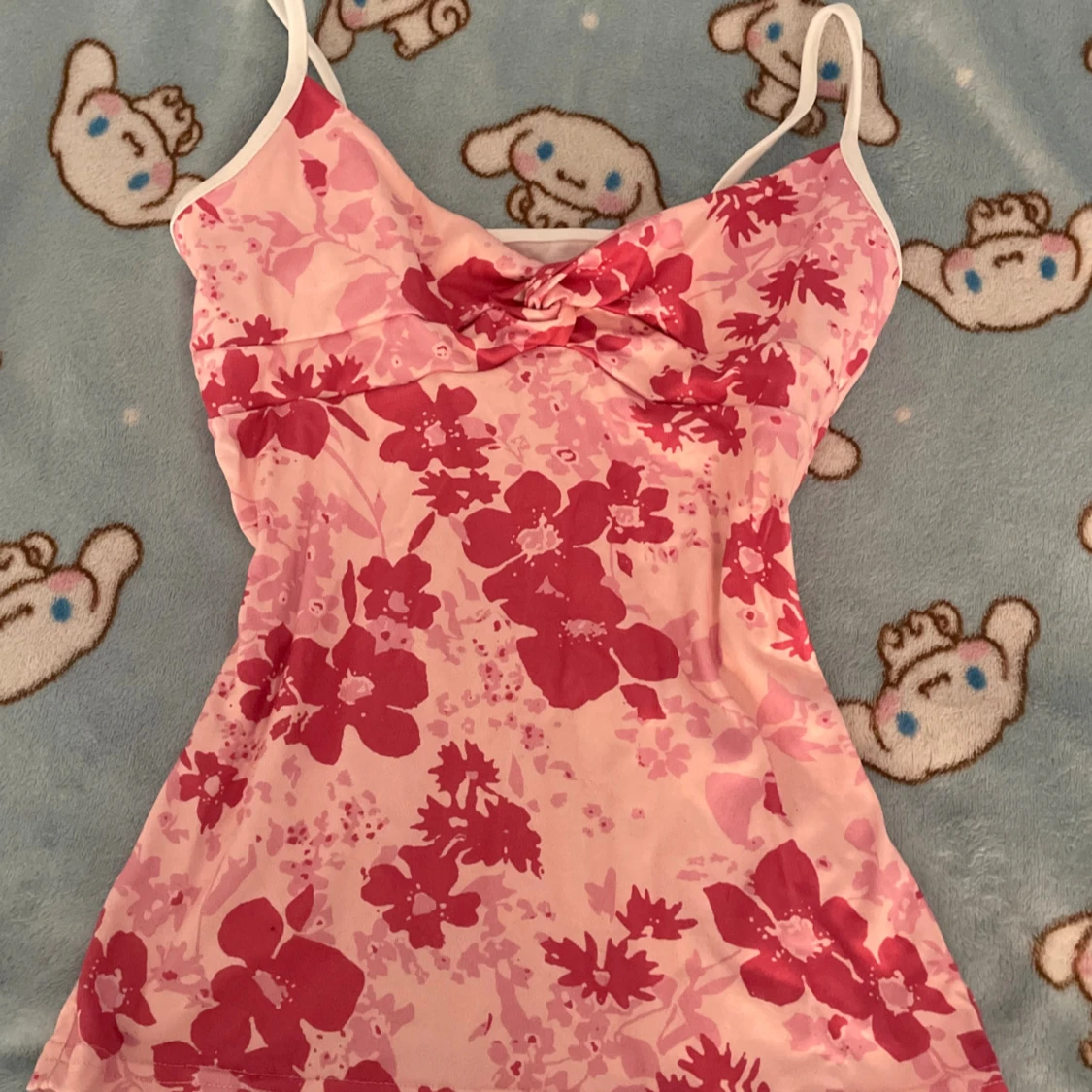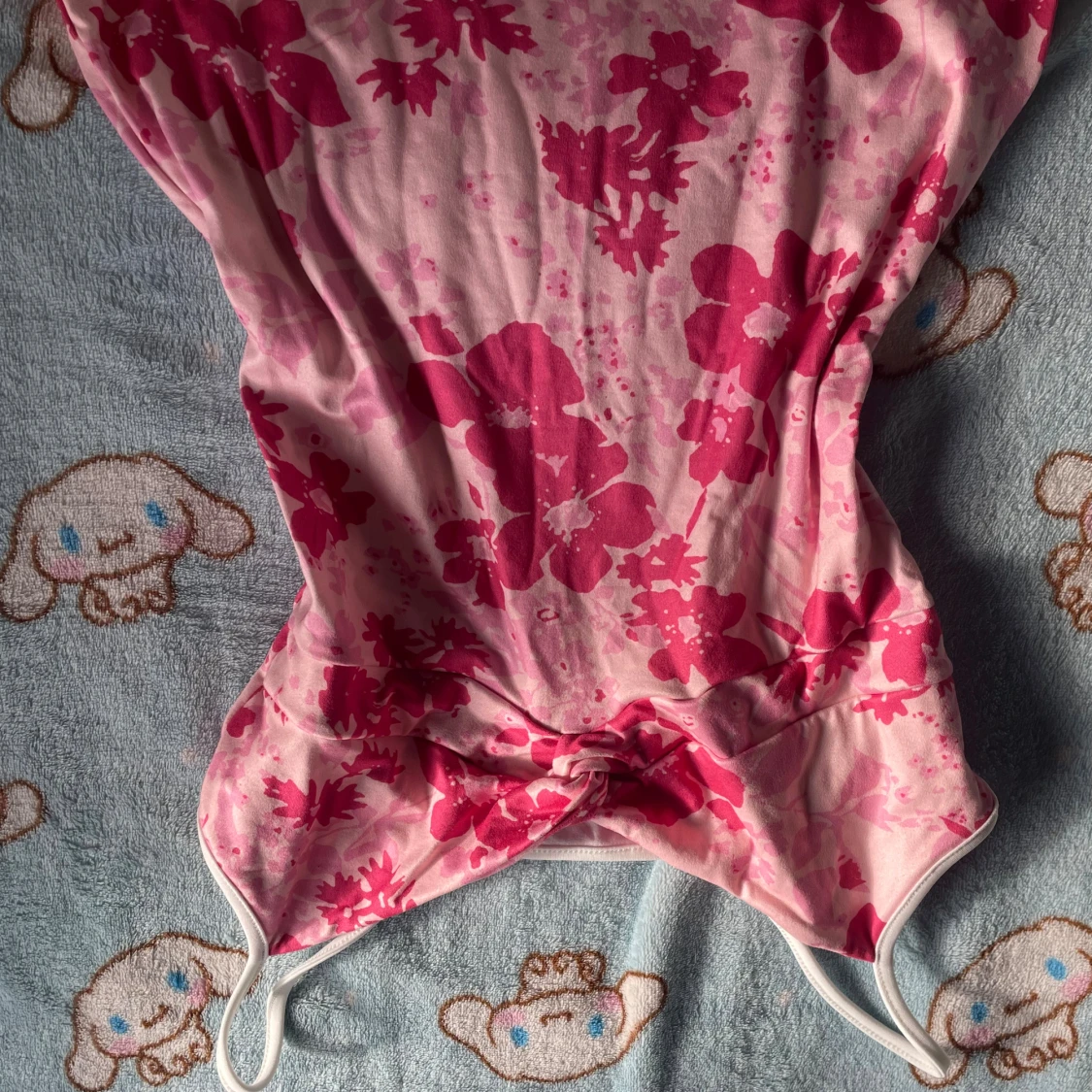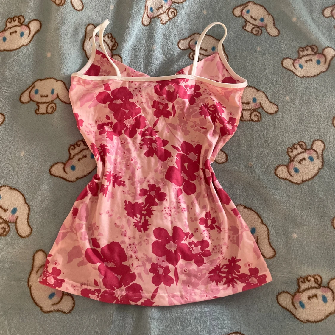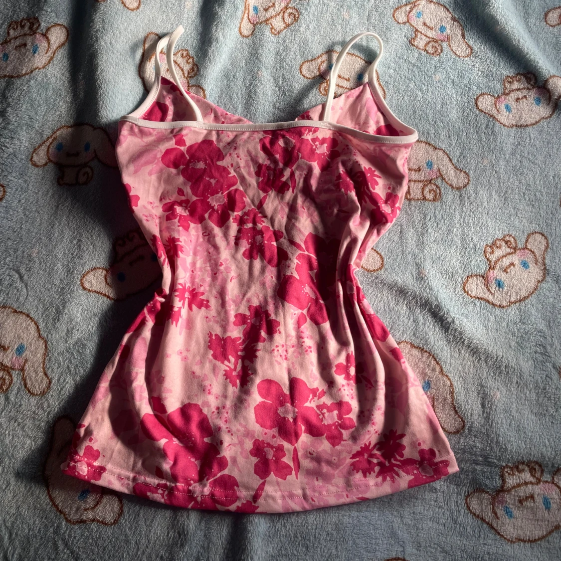 Supersöt topp med smala axelband och blommigt mönster i olika rosa nyanser. Toppen har vit kant runt banden och en lätt figurnära passform. Perfekt för varma dagar och ger en riktigt somrig vibe!