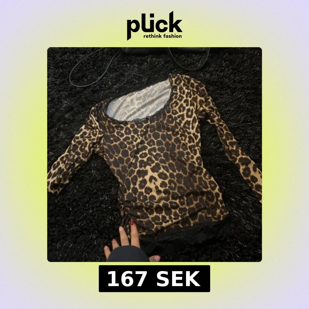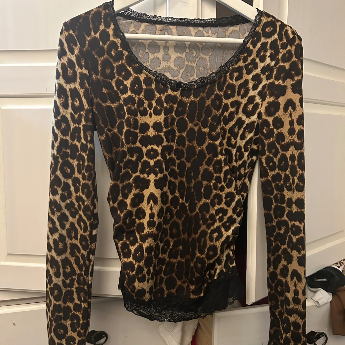Snygg leopardmönstrad topp med långa ärmar och spetsdetaljer vid halsringningen och nederkanten. Knappt använd.