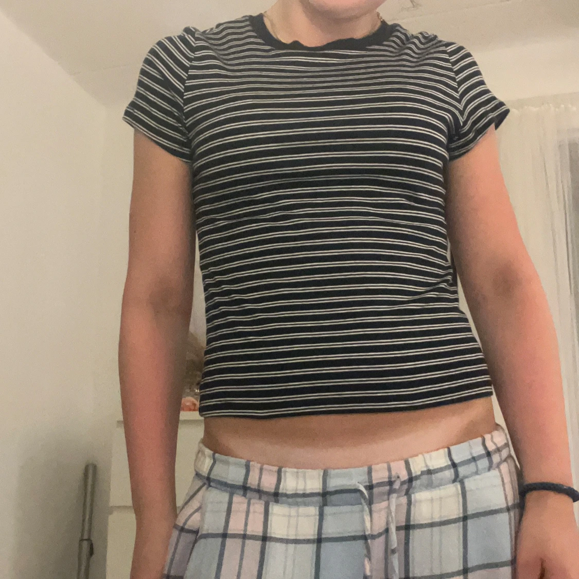 Säljer en svart croppad topp med vita tunna ränder. Knappt använd, skriv för detaljer/bilder😇