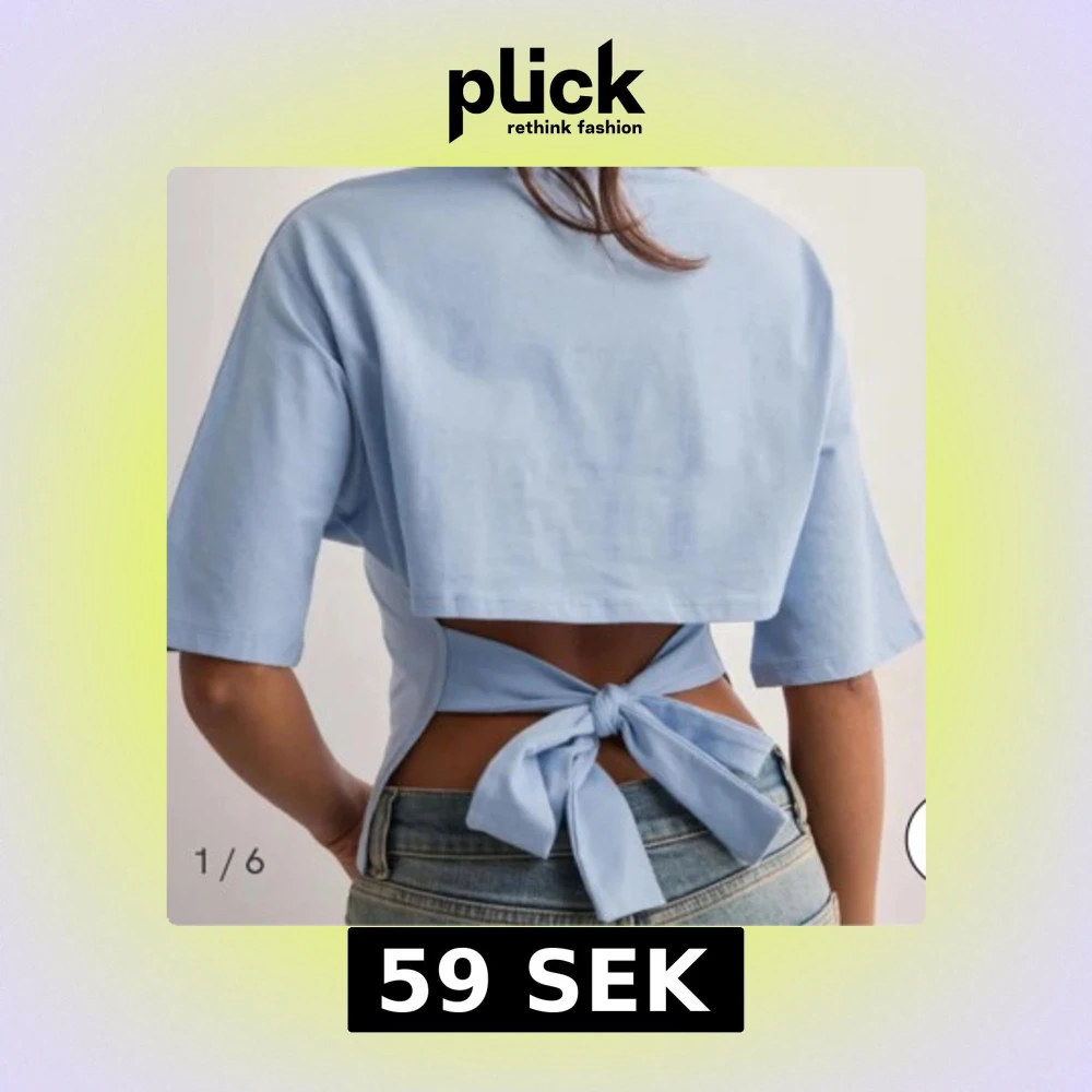 Säljer en ljusblå croppad topp med korta ärmar och snygg öppen rygg med knyt i midjan. Toppen har en enkel, stilren design och är tillverkad i mjukt bomullsmaterial. Perfekt för dig som gillar trendiga detaljer och vill ha en chill look.