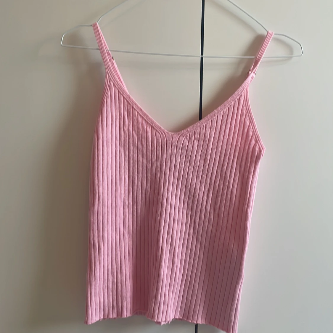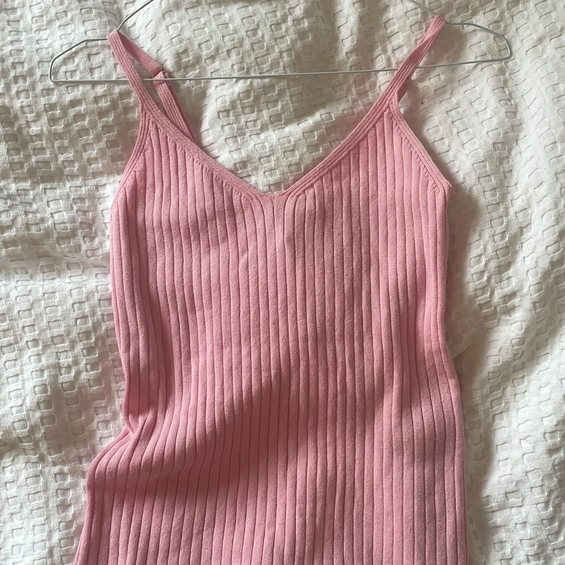 Säljer en ljusrosa ribbad linnetopp med smala axelband och v-ringning. Toppen är ärmlös och har en mjuk, stretchig känsla som gör den superbekväm. Perfekt för varma dagar eller att styla lager på lager.