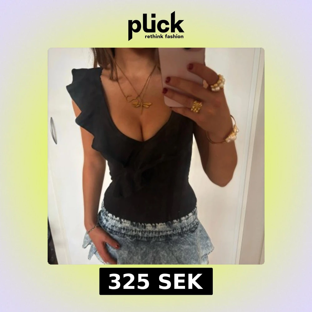 Säljer en svart omlott body med djup v-ringning och volangdetaljer längs axel och framstycke. Materialet är mjukt och stretchigt, Jag är 168 och det är mina bilder, köp via köp nu direkt eller Swish, kvar tills markerad som såld 💖
