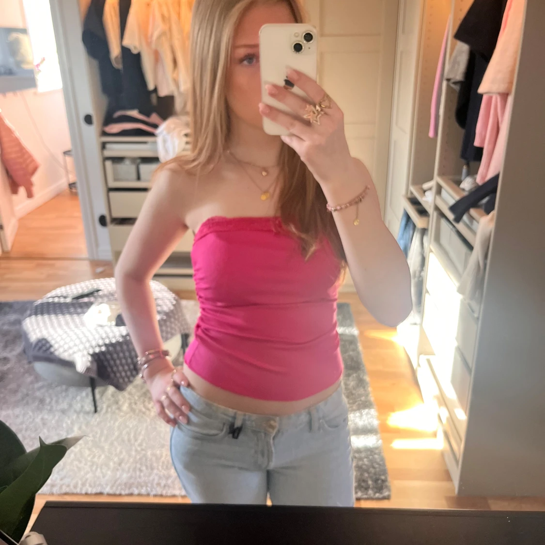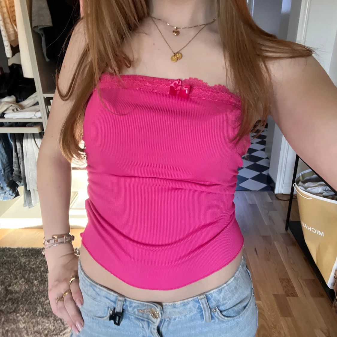 Säljer en snygg rosa ribbad tubtopp med spetsdetaljer och en liten rosett framtill. Perfekt för sommardagar och kan enkelt matchas med jeans eller kjol.